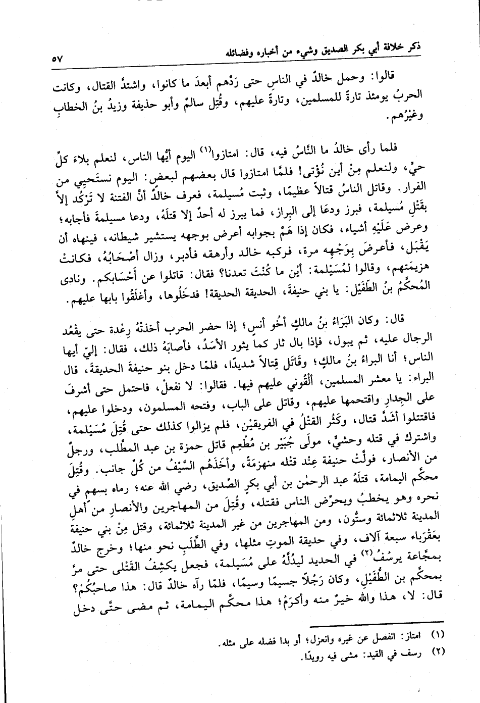قال : وكان البراء بن مالك أخو أنس ؛ إذا حضر الحرب أخذته رعده حتى يقعد الرجال عليه ، ثم يبول ، فإذا بال ثار كما يثور الأسد ، فأصابه ذلك ، فقال : إلى أيها الناس ؛ أنا البراء بن مالك ؛ وقاتل قتالاً شديداً ، فلما دخل بنو حنيفة الحديقة ، قال البراء : يا معشر المسلمين ، ألقوني عليهم فيها . فقالوا : لا نفعل ، فاحتمل حتى أشرف على الجدار واقتحمها عليهم ، وقاتل على الباب ، وفتحه المسلمون ، ودخلوا عليهم ، فاقتتلوا أشد قتال ، وكثر القتل بين الفريقين ، فلم يزالوا كذلك حتى قتل مسيلمة ، واشترك في قتله وحشى ، مولى جبير بن مطعم قاتل حمزة بن عبد المطلب ، ورجل من الأنصار ، فولت حنيفة عند قتله منهزمة ، وأخذهم السيف من كل جانب . وقتل محكم اليمامة ، قتله عبد الرحمن بن أبي بكر الصديق ، رضى الله عنه ؛ رماه بسهم في نحره وهو يخطب ويحرض الناس فقتله ، وقتل من المهاجرين والأنصار من أهل المدينة ثلثمائة وستون ، ومن المهاجرين من غير المدينة ثلثمائة ، وقتل من بني حنيفة بعقرباء سبعة آلاف ، وفي حديقة الموت مثلها ، وفي الطلب نجو منها ؛ وخرج خالد بجماعة يرسف في الحديد ليدله على مسيلمة فجعل يكشف القتلى حتى مر بحكم بن الطفيل وكان رجلاً جسيماً فلما رآه خالد قال : هذا صاحبكم ؟ قال : لا ، هذا والله خير منه وأكرم ؛ هذا محكم اليمامة ، ثم مضى حتى دخل
