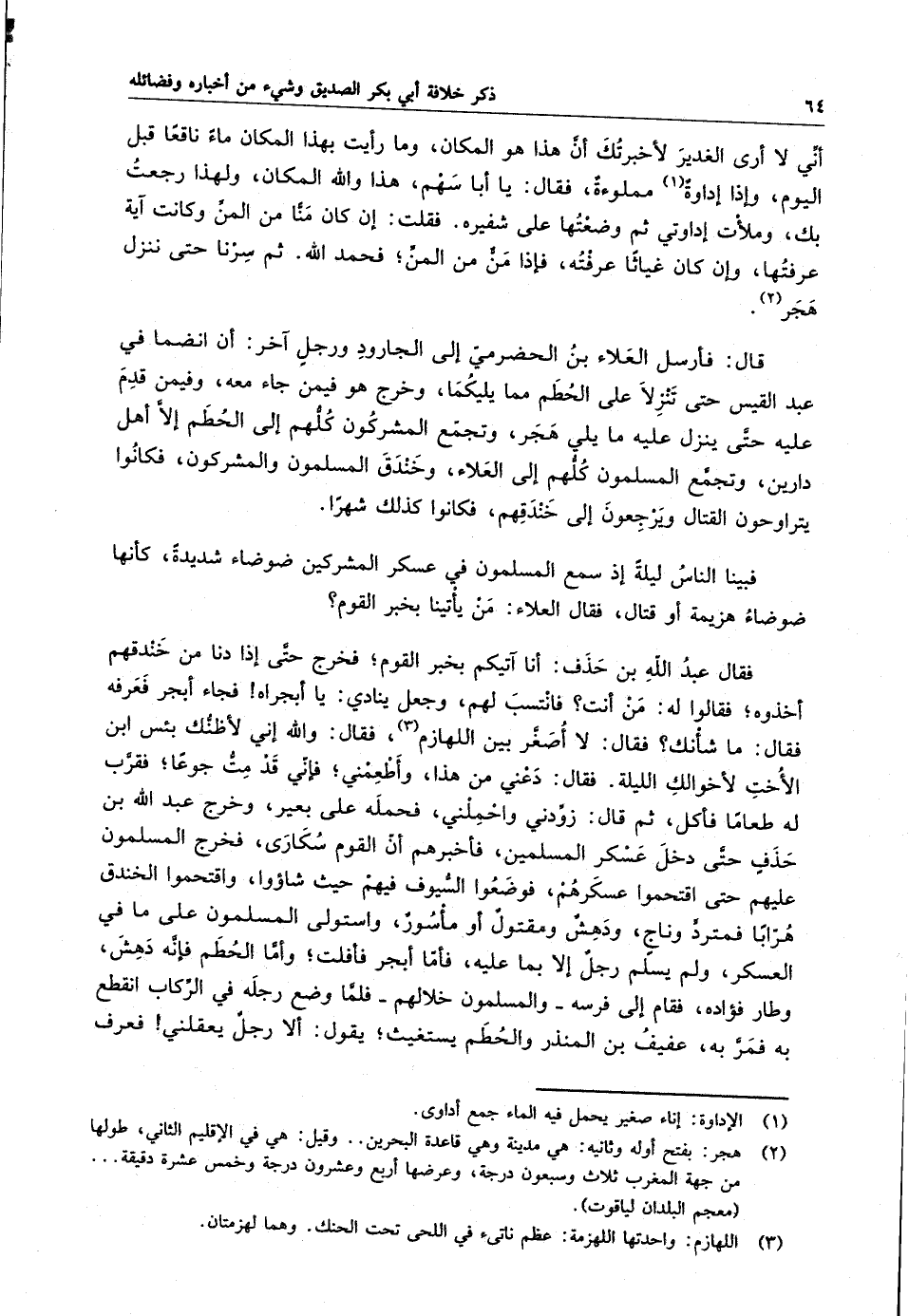 أني لا أرى الغدير لأخبرتك ان هذا هو المكان ، وما رأيت بهذا المكان ماء ناقعاً قبل اليوم ، وإذا إداواة مملوءة ، فقال : يا أبا سهم ، هذا والله المكان ، ولهذا رجعت بك ، وملأت إدواتي ثم وضعتها على شفيره . فقلت : إن كان منا من المن وكانت آية عرفتها ، وإن كان غياثاً عرفته ، فإذا من من المن ؛ فحمد الله . ثم سرنا حتى ننزل هجر .