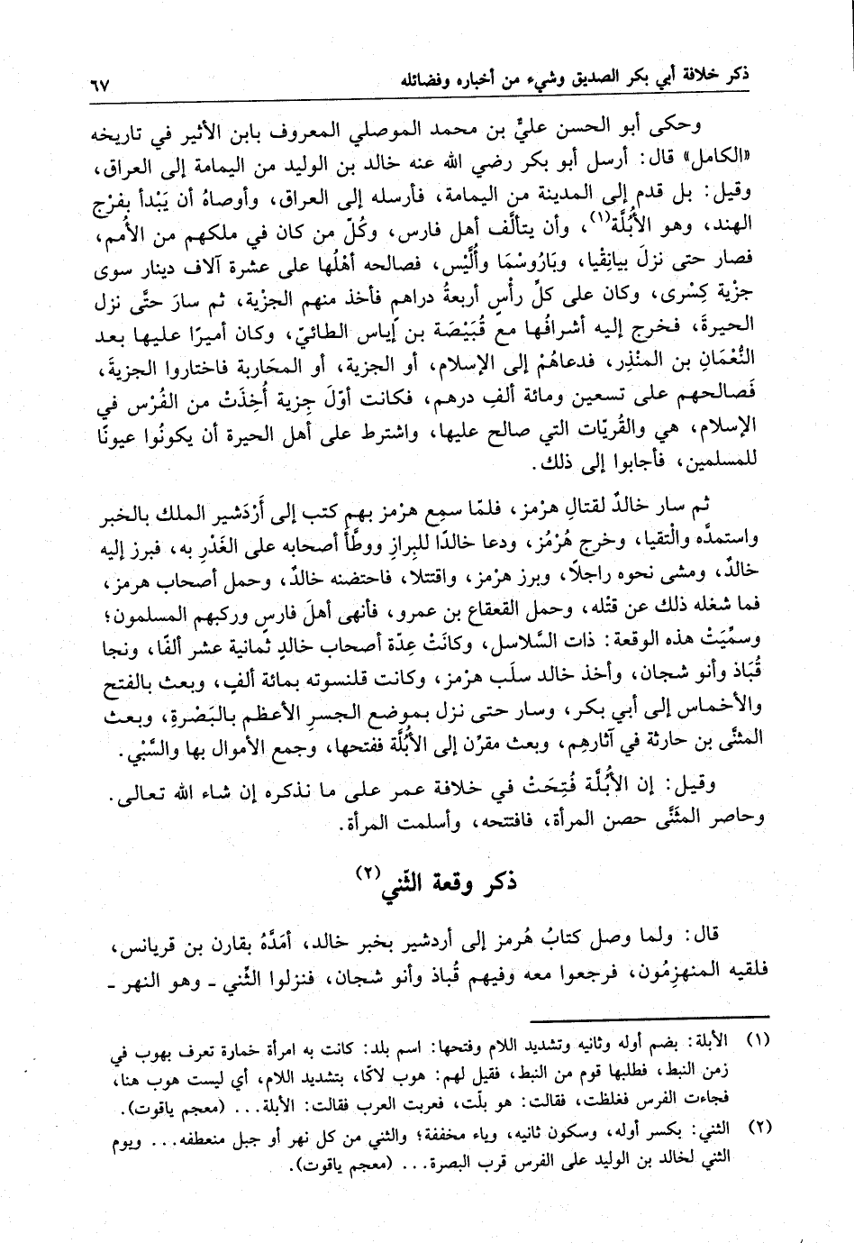 وحكى أبو الحسن على بن محمد الموصلي المعروف بابن الأثير في تاريخه : الكامل . قال : أرسل أبو بكر رضى الله عنه خالد بن الوليد من اليمامة إلى العراق ، وقيل : بل قدم إلى المدينة من اليمامة ، فأرسله إلى العراق ، وأوصاه أن يبدأ بفرج الهند ، وهو الأبله ، وأن يتألف أهل فارس ، وكل من كان في ملكهم من الأمم ، فصار حتى نزل بيانقياً ، وبارسما وأليس ، فصالحه أهلها على عشرة آلاف دينار سوى جزية كسرى ، وكان على كل رأس أربعة دراهم فأخذ منهم الجزية ، ثم سار حتى نزل الحيرة ، فخرج إليه أشرافها مع قبيضة بن إياس الطائي ، وكان أميراً عليها بعد النعمان بن المنذر ، فدعاهم إلى الإسلام ، أو الجزية ، أو المحاربة فاختاروا الجزية ، فصالحهم على تسعين ومائة الف درهم ، فكانت أول جزية أخذت من الفرس في الإسلام ، هي والقريات التي صالح عليها ، واشترط على أهل الحيرة ا ، يكونوا عيوناً للمسلمين ، فاجابوا إلى ذلك .