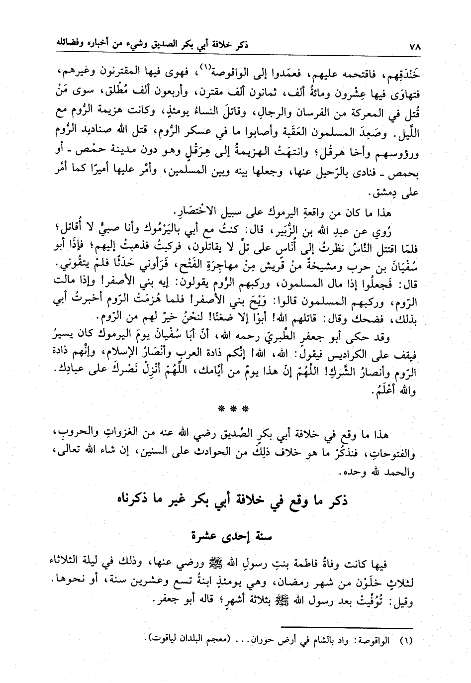 هذا ما وقع ف يخلافة أب ي بكر الصديق رضى الله عنه من الغزوات والحروب ، والفتوحات ، فلنذكر ما هو خلاف ذلك من الحوادث على السنين ، إن شاء الله تعالى ، والحمد لله وحده .