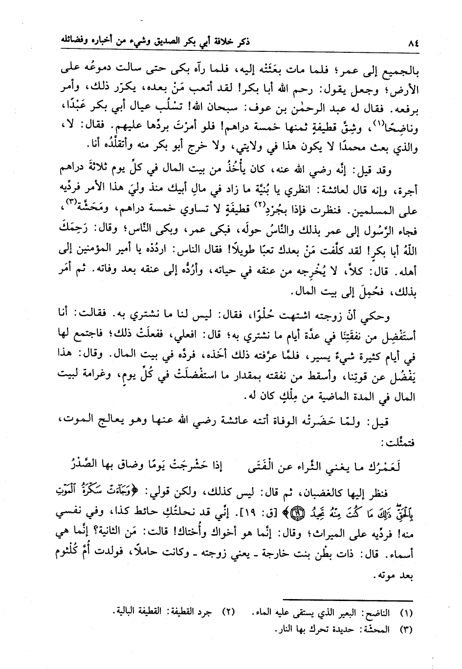 بالجميع إلى عمر ؛ فما مات بعثته إليه ، فلما رآه بكى حتى سالت دموعه على الأرض ؛ وجعل يقول : رحم الله أبا بكر لقد أتعب من بعده ، يكرر ذلك ، وأمر برفعه . فقال له عبد الرحمن بن عوف : سبحان الله تسلب عيال أبي بكر عبداً ، وناضحاً ، وشق قطيفة ثمنها خمسة دراهم فلو أمرت بردها عليهم . فقال : لا ، والذي بعث محمداً لا يكون هذا في ولايتي ، ولاخرج أبو بكر منه وأتقلده أنا .