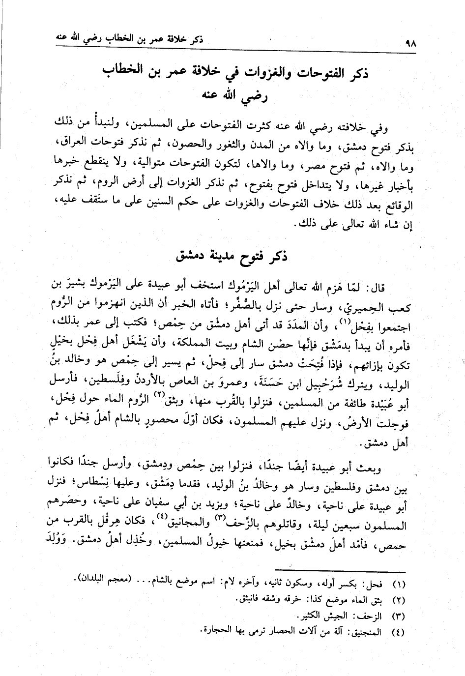 وفي خلافته رضي الله عنه كثرت الفتوحات على المسلمين ، ولنبدأ من ذلك بذكر فتوح دمشق ، وما والاه من المدن والثغور والحصون ، ثم نذكر فتوحات العراق ، وما والاه ، ثم فتوح مصر ، وما والاها ، لتكون الفتوحات متوالية ، ولا ينقطع خبرها بأخبار غيرها ، ولا يتداخل فتوح بفتوح ، ثم نذكر الغزوات على ارض الروم ، ثم نذكر الوقائع بعد ذلك خلاف الفتوحات والغزوات على حكم السنين على ماستقف عليه ، إن شاء الله تعالى على ذلك .