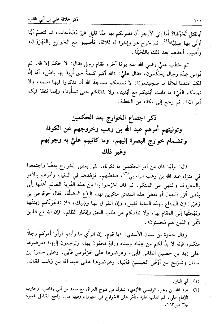 قال : ولما كان من أمر الحكمين ما ذكرناه ، لقي بعض الخوارج بعضاً واجتمعوا في منزل عبد الله بن وهب الراسبي ، فخطبهم ، فزهدهم في الدنيا ، وأمرهم بالأمر بالمعروف والنهي عن المنكر ، ثم قال اخرجوا بنا من هذه القرية الظالم أهلها إلى بعض كور الجبال أو بعض هذه المدائن منكرين لهذه البدع المضلة ، فقال حرقوص بن زهير : " إن المتاع بهذه الدنيا قليل ، وإن الفراق لها وشيك ، فلا تدعونكم زينتها وبهجتها إلى المقام بها ، ولا تلفتنكم عن طلب الحق وإنكار الظلم ، فإن الله مع الذين اتقوا والذين هم محسنون " وقال حمزة بن سنان الأسدي : " يا قوم ، إن الرأي ما رأيتم فولوا أمركم رجلا منكم ، فإنه لا بد لكم من عماد وسناد ورايةٍ تحفون بها ، وترجعون إليها " فعرضوها على زيد بن حصين الطائي فأبى ، وعرضوها على حرقوص فأبى ، وعلى حمزة بن سنان وشريح ابن أوفى العبسي فأبيا ، وعرضوها على عبد الله بن وهب فقال :