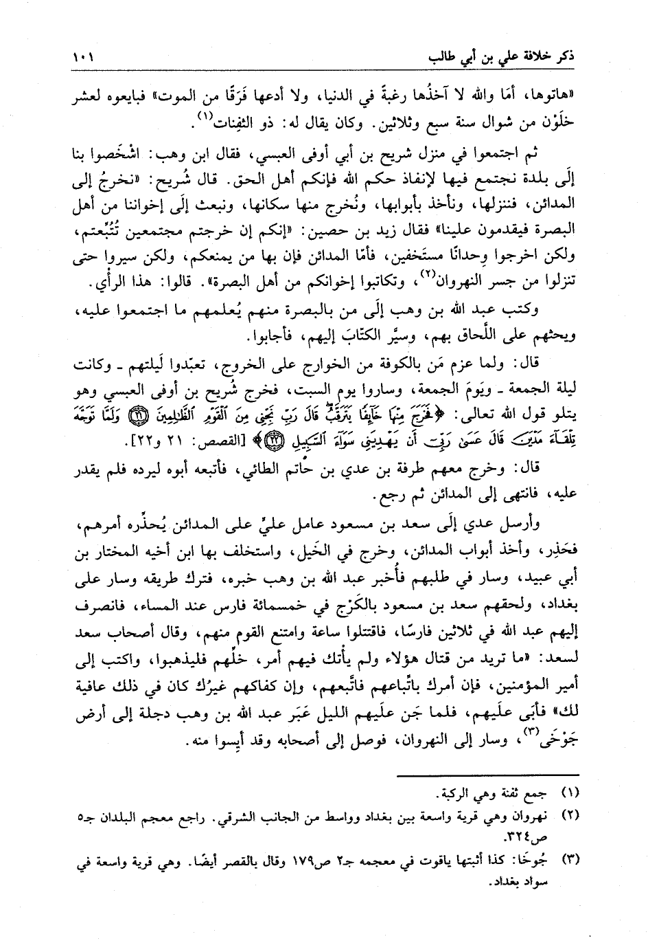 ثم اجتمعوا في منزل شريح بن أوفي العبسي ، فقال ابن وهب : اشخصوا بنا إلى بلدة نجتمع فيها لإنفاذ حكم الله فإنكم أهل الحق . قال شريح : " نخرج إلى المدائن ، فننزلها ، ونأخذ بأبوابها ، ونخرج منها سكانها ، ونبعث إلى إخواننا من أهل البصرة فيقدمون علينا " . فقال زيد بن حصن : " إنكم إن خرجتم مجتمعين تتبعتم ، ولكن اخرجوا واحدنا مستخفين ، فأما المدائن فإن بها من يمنعكم ، ولكن سيروا حتى تنزلوا من جسر النهروان ، وتكاتبوا إخوانكم من أهل البصرة " . قالوا : هذا الرأي .