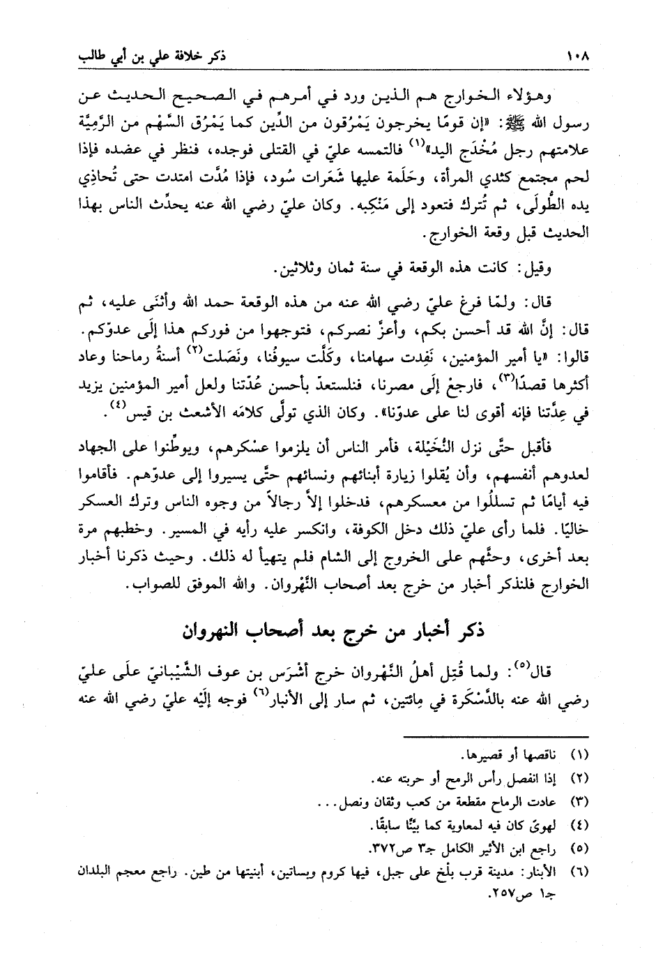 وهؤلاء الخوارج هم الذين ورد في أمرهم في الصحيح الحديث عن رسول الله ( صلى الله عليه وسلم ) : " إن قوماً يخرجون يمرقون من الدين كما يمرق السهم من الرمية علامتهم رجل مخدج اليد " فالتمسه علي في القتلى فوجده ، فنظر في عضده فإذا لحم مجتمع كثدي المرأة ، وحلمة عليها شعرات سود ، فإذا مدت امتدت حتى تحاذي يده الطولى ، ثم تترك فتعود إلى منكبه . وكان علي رضي الله عنه يحدث الناس بهذا الحديث قبل وقعة الخوارج .
