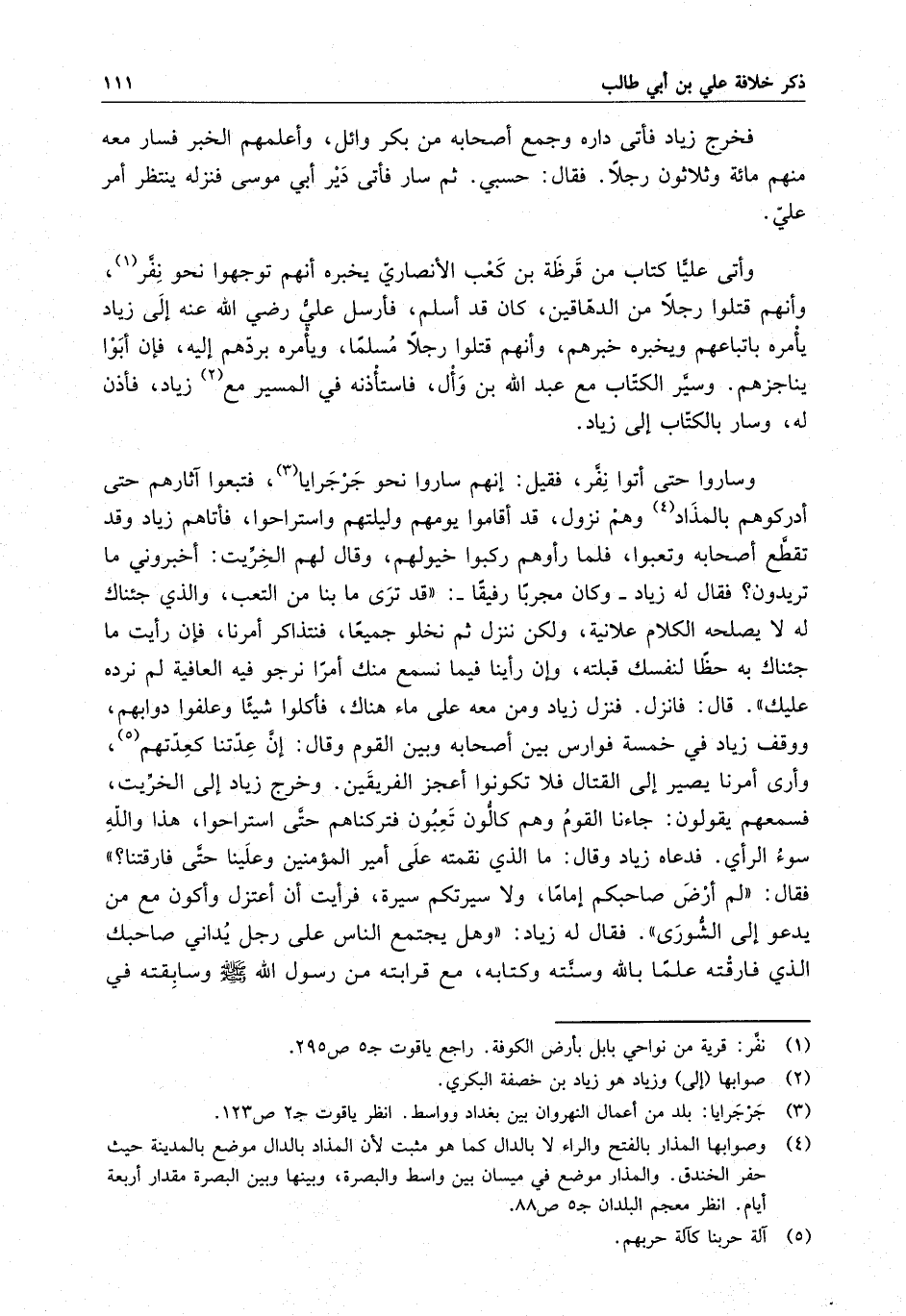 وأتى علياً كتاب من قرظة بن كعب الأنصاري يخبره أنهم توجهوا نحون نفر ، وأنهم قتلوا رجلاً من الدهاقين ، كان قد أسلم ، فأرسل عليٌ رضي الله عنه إلى زياد يأمره باتباعهم ويخبره خبرهم ، وأنهم قتلوا رجلاً مسلماً ، ويأمره بردهم إليه ، فإن أبو يناجزهم . وسير الكتاب مع عبد الله بن وأل ، فاستأذنه في المسير مع زياد ، فأذن له ، وسار بالكتاب إلى زياد . وساروا حتى أتوا نفر ، فقيل : إنهم ساروا نحو جرجرايا ، فتبعوا آثارهم حتى أدركوهم بالمذاد وهم نزول ، قد أقاموا يومهم وليلتهم واستراحوا ، فأتاهم زياد وقد تقطع أصحابه وتعبوا ، فلما رأوهم ركبوا خيولهم ، وقال لهم الخريت : أخبروني ما تريدون ؟ فقال له زياد - وكان مجربا رفيقا - : " قد ترى ما بنا من التعب ، والذي جئناك له لا يصلحه الكلام ، ولكن ننزل ثم نخلو جميعا ، فنتذاكر أمرنا ، فإن رأيت ما جئناك به حظا لنفسك قبلته ، وإن رأينا فيما نسمع منك أمرا نرجو فيه العافية لم نرده عليك " . قال : فانزل . فنزل زياد ومن معه على ماء هناك ، فأكلوا شيئاً وعلفوا دوابهم ، ووقف زياد في خمسة فوارس بين أصحابه وبين القوم وقال : إن عدتنا كعدتهم ، وأرى أمرنا يصير إلى القتال فلا تكونوا أعجز الفريقين . وخرج زياد إلى الخريت ، فسمعهم يقولون : جاءنا القوم وهم كالون يعبون فتركناهم حتى استراحوا ، هذا والله سوء الرأي . فدعاه زياد وقال : ما الذي نقمته على أمير المؤمنين وعلينا حتى فارقتنا ؟ " فقال : " لم أرض صاحبكم إماما ، ولا سيرتكم سيرة ، فرأيت أن أعتزل وأكون مع من يدعو إلى الشورى " . فقال له زياد : " وهل يجتمع الناس على رجل يداني صاحبك الذي فارقته علما بالله وسنته وكتابه . مع قرابته من رسول الله ( صلى الله عليه وسلم ) وسابقته في
