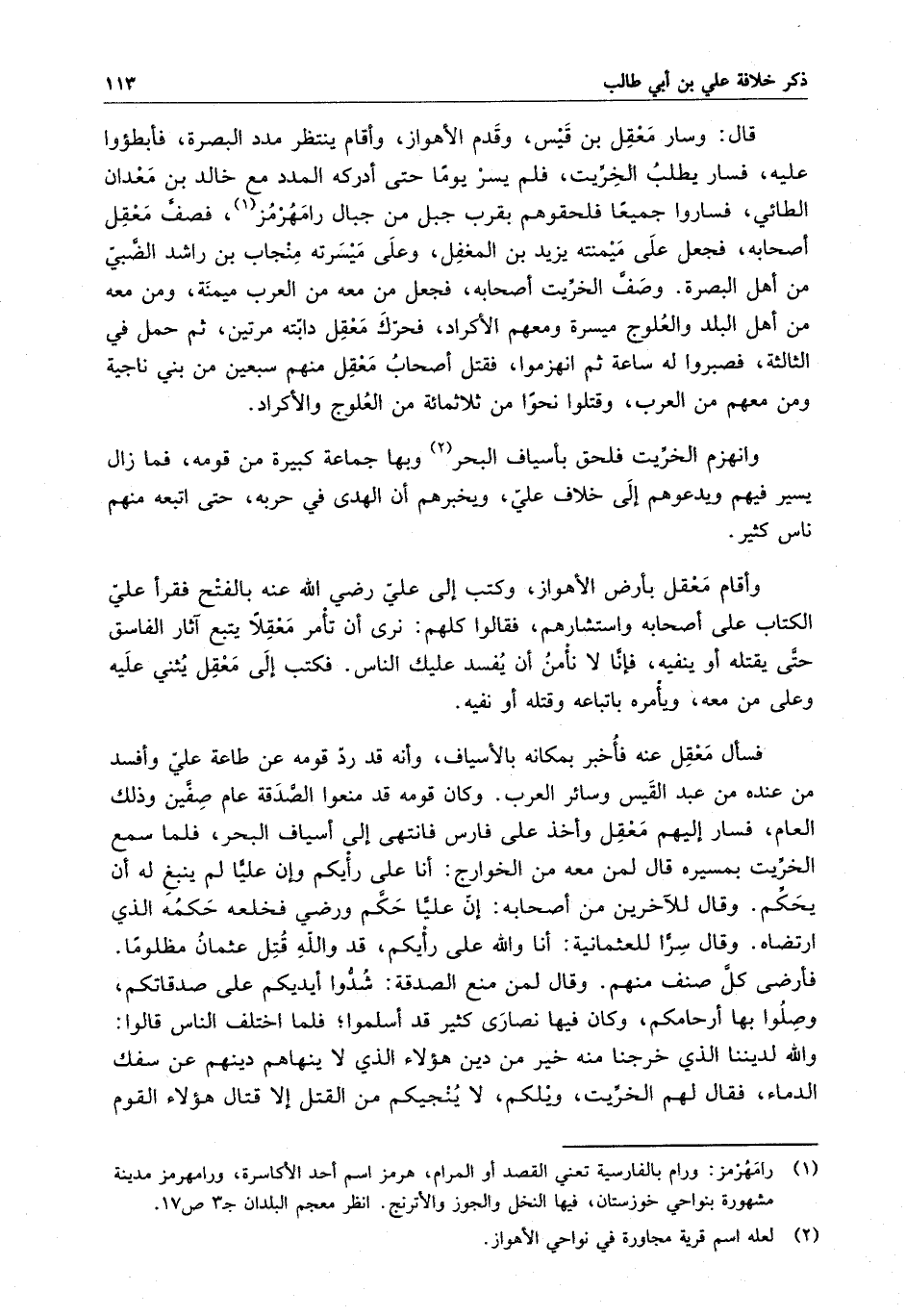 قال : وسار معقل بن قيس ، وقدم الأهواز ، وأقام ينتظر مدد البصرة ، فأبطئوا عليه ، فسار يطلب الخريت ، فلم يسر يوما حتى أدركه المدد مع خالد بن معدان الطائي ، فساروا جميعاً فلحقوهم بقرب جبل من جبال رامهرمز ، فصف معقل أصحابهن فجعل على ميمنته يزيد بن المغفل ، وعلى ميسرته منجاب بن راشد الضبي من أهل البصرة . وصف الخريت أصحابه ، فجعل من معه من العرب ميمنة ، ومن معه من أهل البلد والعلوج ميسرة ومعهم الأكراد ، فحرك معقل دابته مرتين ، ثم حمل في الثالثة فصبروا له ساعة ثم انهزموا ، فقتل أصحاب معقل منهم سبعين من بني ناجية ومن معهم من العرب ، وقتلوا نحواً من ثلاثمائة من العلوج والأكراد . وانهزم الخريت فلحق بأسياف البحر وبها جماعة كبيرة من قومه ، فما زال يسير فيهم ويدعوهم إلى خرف علي ، ويخبرهم أن الهدى في حربه ، حتى اتبعه منهم ناس كثير . وأقام معقل بأرض الأهواز ، وكتب إلى علي رضي الله عنه بالفتح فقرأ علي الكتاب على أصحابه واستشارهم ، فقالوا كلهم : نرى أن تأمر معقلا يتبع آثار الفاسق حتى يقتله أو ينفيه ، فإنا لا نأمن أن يفسد عليك الناس . فكتب إلى معقل يثني عليه وعلى من معه ، ويأمره باتباعه وقتله أو نفيه .