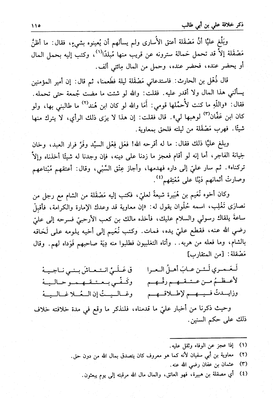 وبلغ علياً أن مصقلة أعتق الأسارى ولم يسألهم أن يعينوه بشيء ، فقال : ما أظن مصقلة إلا قد تحمل حمالة سترونه عن قريب منها ملبدا ، وكتب إليه بحمل المال أو يحضر عنده ، فحضر عنده ، وحمل من المال مائتي ألف . قال ذهل ابن الحارث : فاستدعاني مصقلة ليلة فطعمنا ، ثم قال : إن أمير المؤمنين يسألني هذا المال ولا أقدر عليه . فقلت : " والله ما كنت لأحملها قومي ؛ أما والله لو كان ابن هند ما طالبني بها ، ولو كان ابن عفان لوهبها لي " . قال فقلت : إن هذا لا يرى ذلك الرأي ، لا يترك منها شيئاً . فهرب مصقلة من ليلته فلحق بمعاوية .