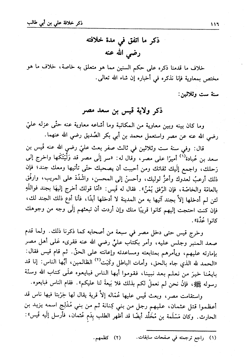 قال : وفي سنة ست وثلاثين في ثالث صفر بعث علي رضي الله عنه قيس بن سعد بن عبادة أميراً على مصر ، وقال له : " سر إلى مصر قد وليتكها واخرج إلى رحلك ، واجمع إليك ثقاتك ومن أحببت أن يصبحك حتى تأتيها ومعك جند ؛ فإن ذلك أرعب لعدوك وأعز لوليك ، وأحسن إلى المحسن ، واشدد على المريب ، وارفق بالعامة والخاصة ، فإن الرفق يمن " . فقال له قيس : " أما قولك أخرج إليها بجند فوالله لئن لم أدخلها إلا بجند آتيها به من المدينة لا أدخلها أبداً ، فأنا فأنا أدع ذلك الجند لك ، فإن كنت احتجت إليهم كانوا قريباً منك وإن أردت أن تبعثهم إلى وجه من وجوهك كانوا عدة " .