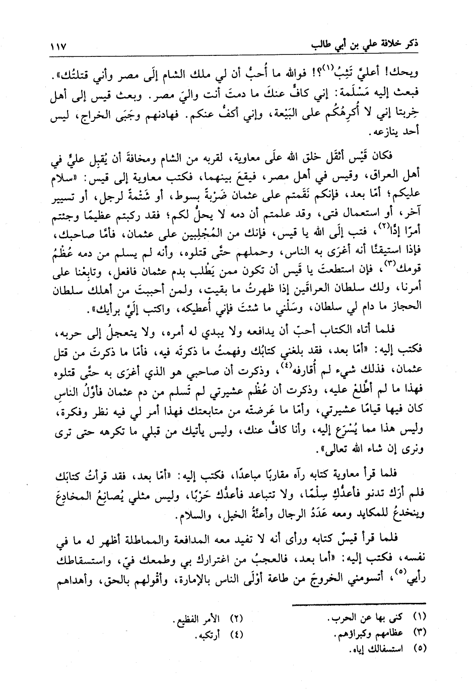ويحك . أعلي تثب ؟ فوالله ما أحب أن لي ملك الشام إلى مصر وأني قتلتك " . فبعث إليه مسلمة : إني كاف عنك ما دمت أنت والي مصر . وبعث قيس إلى أهل خربتا إني لا أكرهكم على البيعة ، وإني أكف عنكم . فهادنم وجبى الخراج ، ليس أحد ينازعه . فكان قيس أثقل خلق الله على معاوية ، لقربه من الشام ومخافة أن يقبل علي في أهل العراق ، وقيس في أهل مصر ، فيقع بينهما ، فكتب معاوية إلى قيس : " سلام عليكم ؛ أما بعد ، فإنكم نقمتم على عثمان ضربةً بسوط ، أو شتمة لرجل ، أو تسيير آخر ، أو استعمال فتى ، وقد علمتم أن دمه لا يحل لكم فقد ركبتم عظيماً وجئتم أمراً إداً ، فتب إلى الله يا قيس ، فإنك من المجلبي على عثمان ، فأما صاحبك ، فإذا استيقنا أنه أغرى به الناس ، وحملهم حتى قتلوه ، وأنه لم يسلم من دمه عظم قومك ، فإن استطعت يا قيس أن تكون ممن يطلب بدم عثمان فافعل ، وتابعنا على أمرنا ، ولك سلطان العراقين إذا ظهرت ما بقيت ، ولمن أحببت من أهلك سلطان الحجاز ما دام لي سلطان ، وسلني ما شئت فإني أعطيكه ، واكتب إلي برأيك " .