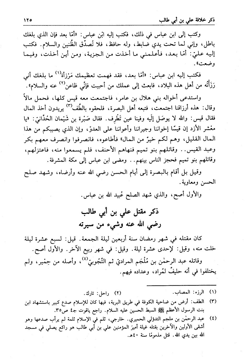 وكتب إلى ابن عباس في ذلك ، فكتب إليه ابن عباس : " أما بعد فإن الذي بلغك باطل ، وإني لما تحت يدي ضابط ، وله حافظ ، فلا تصدق الظنين والسلام . فكتب إليه علي : أما بعد ، فأعلمني ما أخذت من الجزية ، ومن أين أخذت ، وفيما وضعت " .