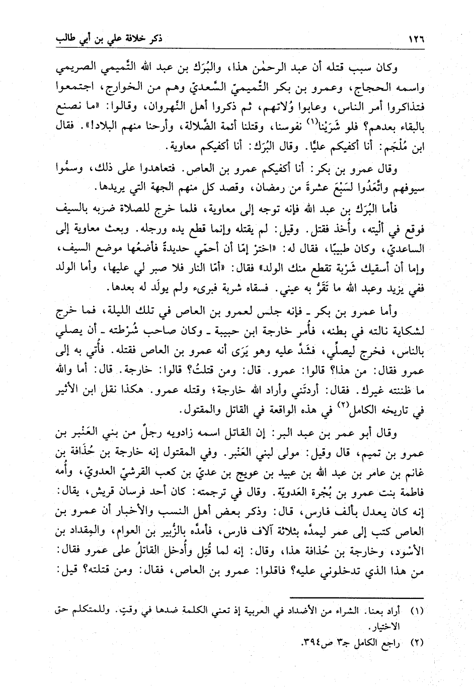 فأما البرك بن عبد الله فإنه توجه إلى معاوية ، فلما خرج للصلاة ضربه بالسيف فوقع في إليته ، وأخذ فقتل . وقيل : لم يقتله وإنما قطع يده ورجله . وبعث معاوية إلى الساعدي ، وكان طبيباً ، فقال له : " اختر إما أن أحمي حديدة فأضعها موضع السيف ، وإما أن أسقيك شربة تقطع منك الولد " . فقال : " أما النار فلا صبر لي عليها ، وأما الولد ففي يزيد وعبد الله ما تقر به عيني . فسقاه شربة فبرئ ولم يولد له بعدها . وأما عمرو بن بكر - فإنه جلس لعمرو بن العاص في تلك الليلة ، فما خرج لشكاية نالته في بطنه ، فأمر خارجة ابن حبيبة - وكان صاحب شرطته - أن يصلي بالناس ، فخرج ليصلي ، فشد عليه وهو يرى أنه عمرو بن العاص فقتله . فأتى به إلى عمرو فقال : من هذا ؟ . قالوا : عمرو . قال ومن قتلت ؟ قالوا : خارجة . قال : أما والله ما ظننته غيرك . فقال : أردتني وأراد الله خارجة ؛ وقتله عمرو . هكذا نقل ابن الأثير في تاريخه الكامل في هذه الواقعة في القاتل وقال أبو عمر بن عبد البر : إن القاتل اسمه زادويه رجل من بني العنبر بن عمرو بن تميم ، قال وقيل : مولى لبني العنبر . وفي المقتول إنه خارجة بن حذافة بن غانم بن عامر بن عبد الله بن عبيد ابن عويج بن عدي بن كعب القرشي العدوي ، وأمه فاطمة بن عمرو بن بجرة العدوية . وقال في ترجمته : كان أحد فرسان قريش ، يقال : إنه كان يعدل بألف فارس ، قال : وذكر بعض أهل النسب والأخبار أن عمرو بن العاص كتب إلى عمر ليمده بثلاثة آلاف فارس ، فأمده بالزبير بن العوام ، والمقداد بن الأسود ، وخارجة بن حذافة هذا ، وقال : إنه لما قتل وأدخل القاتل على عمرو فقال : من هذا الذي تدخلوني عليه ؟ فقالوا : عمرو بن العاص ، فقال : ومن قتلته ؟ قيل :