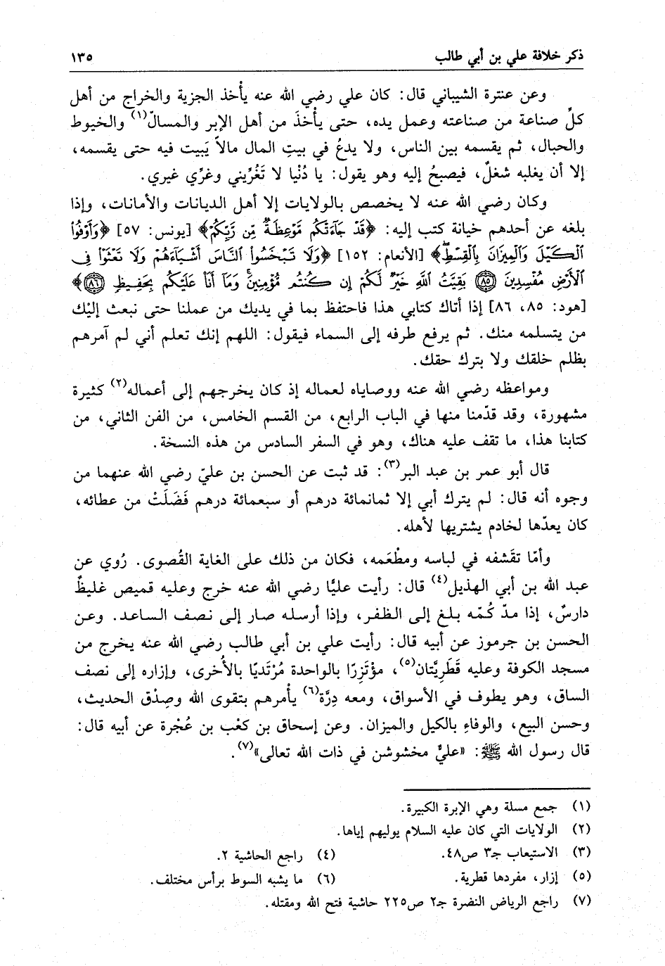 وعن عنترة الشيباني قال : كان علي رضي الله عنه يأخذ الجزية والخراج من أهل كل صناعة من صناعته وعمل يده ، حتى يأخذ من أهل الإبر والمسال والخيوط والحبال ، ثم يقسمه بين الناس ، ولا يدع في بيت المال مالاً يبيت فيه حتى يقسمه إلا أن يغلبه شغل ، فيصبح إليه وهو يقول . يادنيا لا تغريني وغري غيري .