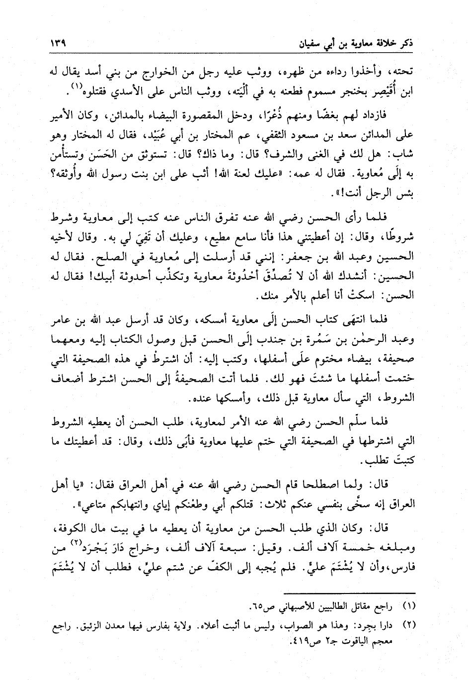 قال : وكان الذي طلب الحسن من معاوية أن يعطيه ما في بيت مال الكوفة ومبلغه خمسة آلاف ألف . وقيل : سبعة آلاف ألف وخراج داره بجرد من فارس وأن لا يشتم علي .
