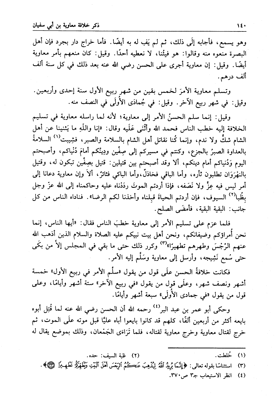 وحكى أبو عمر ابن عبد البر رحمه الله أن الحسن رضي الله عنه لما قتل أبوه بايعه أكثر من أربعين ألفاً ، كلهم قد كانوا بايعوا أباه علياً قبل موته على الموت ، ثم خرج لقتال معاوية وخرج معاوية لقتاله ، فلما تراءى الجمعان - وذلك بموضع يقال له