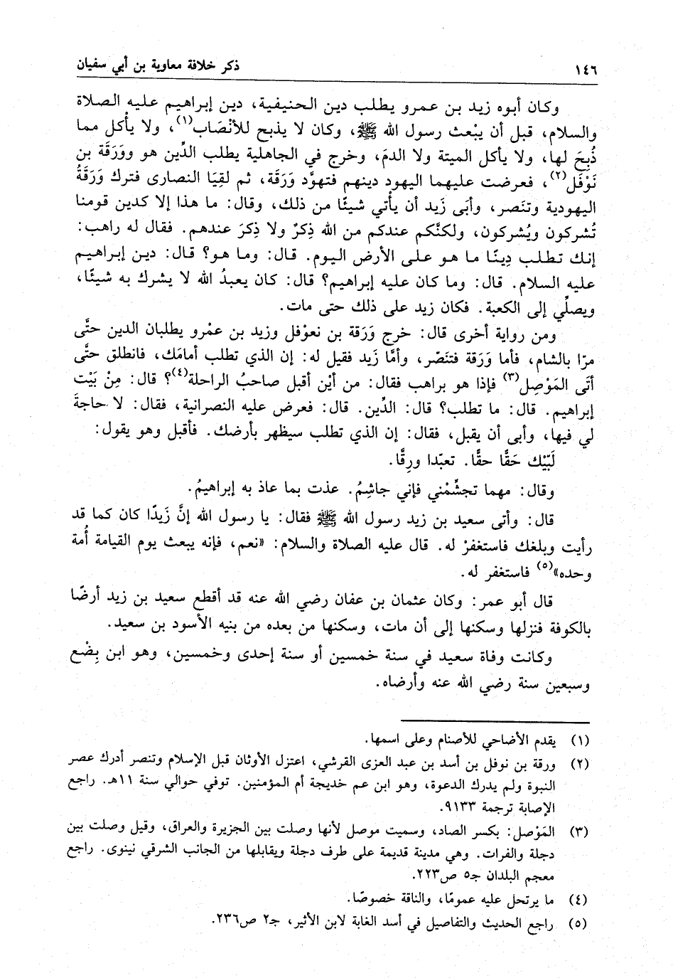 ومن رواية أخرى قال : خرج ورقة بن نوفل وزيد بن عمرو يطلبان الدين حتى مرا بالشام ، فأما ورقة فتنصر ، وأما زيد فقيل له : إن الذي تطلب أمامك ، فانطلق حتى أتى الموصل فإذا هو براهب فقال : من أين أقبل صاحب الراحلة ؟ قال من بيت إبراهيم . قال : ما تطلب ؟ قال : الدين . قال : فعرض عليه النصرانية ، فقال : لا حاجة لي فيها ، وأبى أن يقبل ، فقال : إن الذي تطلب سيظهر بأرضك . فأقبل وهو يقول : لبيك حقاً حقاً . تعبد ورقا .