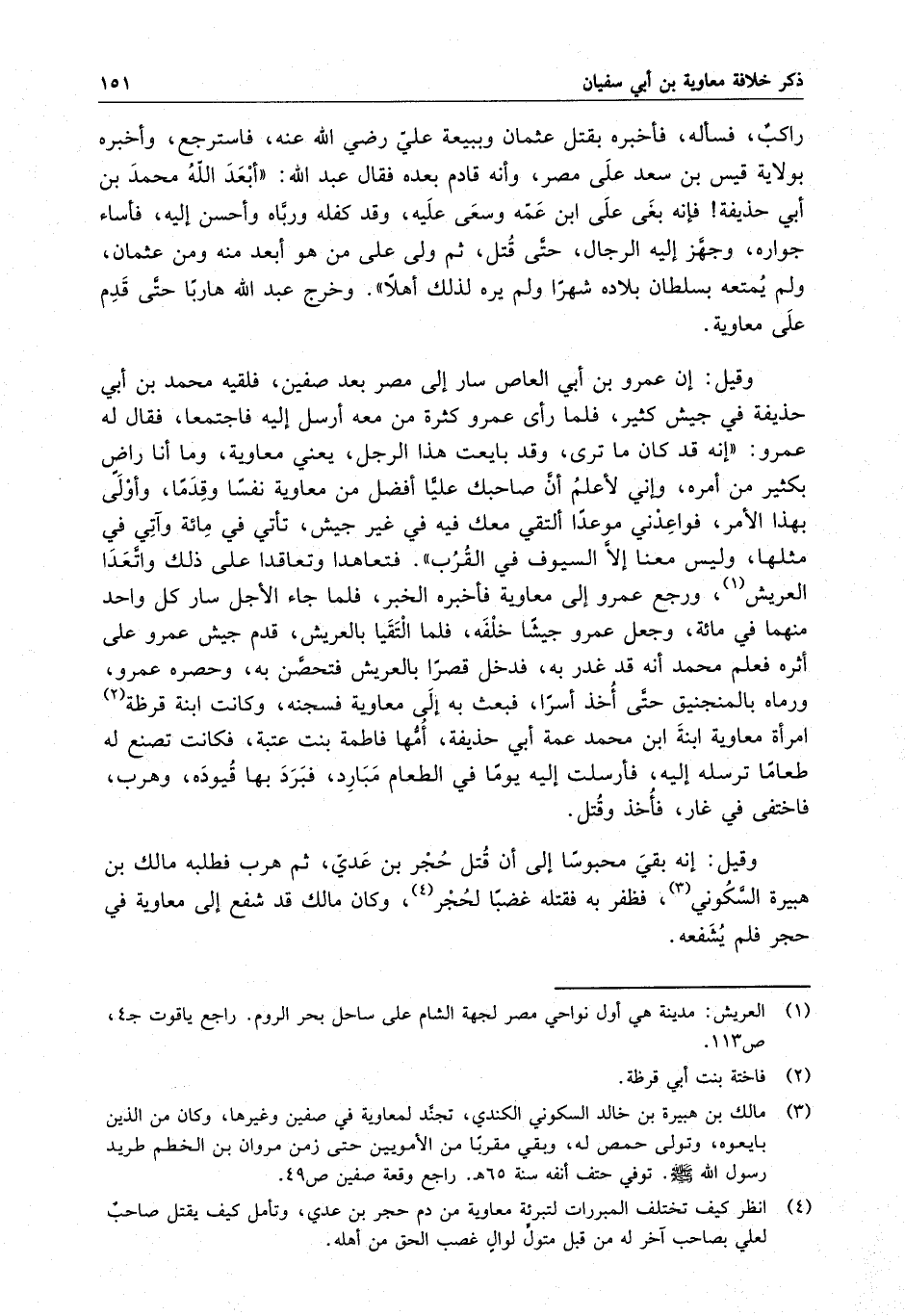 فتعاهدا وتعاقدا على ذلك واتعدا العريش ، ورجع عمرو إلى معاوية فأخبره الخبر ، فلما جاء الأجل سار كل واحد منهما في مائة ، وجعل عمرو جيشاً خلفه ، فلما التقيا بالعريش ، قدم جيش عمرو على أثره فعلم محمد أنه قد غدر به ، فدخل قصراً بالعريش فتحصن به ، وحصره عمرو ، ورماه بالمنجنيق حتى أخذ أسيراً ، فبعث به إلى معاوية فسجنه ، وكانت ابنة قرظة امرأة معاوية ابنة محمد عمة أبي حذيفة ، أمها فاطمة بنت عتبة ، فكانت تصنع له طعاماً ترسله إليه ، فأرسلت إليه يوماً في الطعام مبارد ، فبرد بها قيوده ، وهرب ، فاختفى في غار ، فأخذ وقتل .