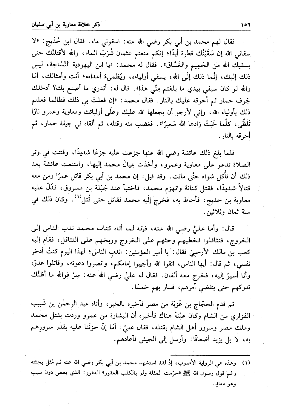 فلما بلغ ذلك عائشة رضي الله عنها جزعت عليه جزعاً شديداً ، وقنتت في وتر الصلاة تدعو على معاوية وعمرو ، وأخذت عيال محمد إليها ، وامتنعت عائشة بعد ذلك أ ، تأكل شواء حتى ماتت . وقد قيل : إن محمد بن أبي بكر قاتل عمراً ومن معه قتالاً شديداً ، فقتل كنانة وانهزم محمد ، فاختبأ عند جبلة بن مسروق ، فدل عليه معاوية ابن حديج ، فأحاط به ، فخرج إليه محمد فقاتل حتى قتل . وكان ذلك في سنة ثمان وثلاثين .