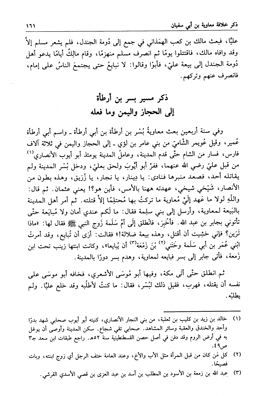 وفي سنة أربعين بعث معاوية بسر بن أرطاة بن أبي أرطاة - واسم أبي أرطاة عمير ، وقيل عويمر الشامي من بني عامر بن لؤي - إلى الحجاز واليمن في ثلاثة آلاف فارس ، فسار من الشام حتى قدم المدينة ، وعامل المدينة يومئذ أبو أيوب الأنصاري من قبل على رضي الله عنهما ، ففر أبو أيوب ولحق بعلي ، ودخل بسر المدينة ولم يقاتله أحد ، فصعد منبرها فنادى : يا دينار ، يا نجار ، يا زريق وهذه بطون من الأنصار شيخي شيخي ، عهدته ههنا بالأمس ، فأين هو ؟ يعني عثمان . ثم قال : والله لولا ما عهد إلى معاوية ما تركت بها محتلماً إلا قتلته .