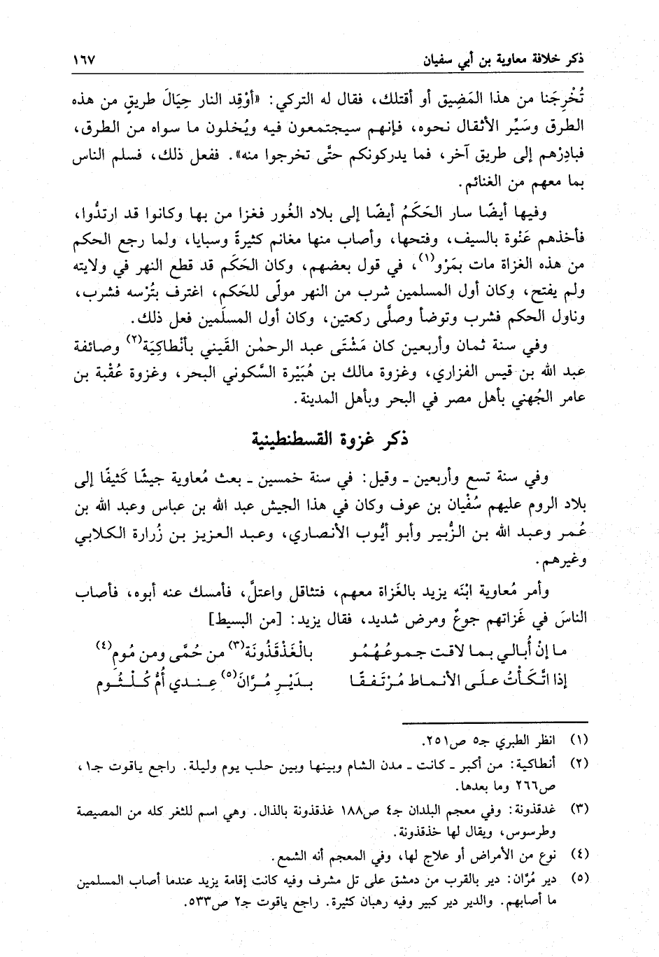 وأمر معاوية ابنه يزيد بالغزاة معهم ، فتثاقل واعتل ، فأمسك عنه أبوه ، فأصاب الناس في غزاتهم جوع ومرض شديد ، فقال يزيد :