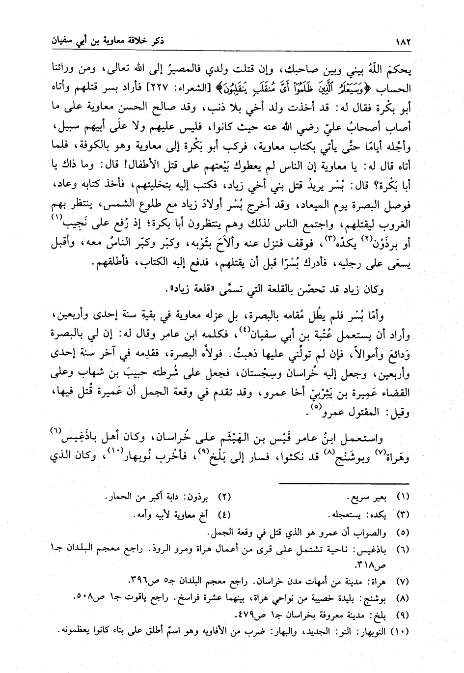 يحكم الله بيني وبين صاحبك ، وإن قتلت ولدي فالمصير إلى الله تعالى ، ومن ورائنا الحساب " وسيعلم الذين ظلموا إي منقلب ينقلبون " فأراد بسر قتلهم وأتاه أبو بكرة فقال له : قد أخذت ولد أخي بلا ذنب ، وقد صالح الحسن معاوية على ما أصاب أصحاب علي رضي الله عنه حيث كانوا ، فليس عليهم ولا على أبيهم سبيل ، وأجله أياماً حتى يأتي بكتاب معاوية ، فركب أبو بكرة إلى معاوية وهو بالكوفة ، فلما أتاه قال له : يا معاوية إن الناس لم يعطوك بيعتهم على قتل الأطفال قال : وما ذاك يا أبا بكرة ؟ قال : بسر يريد قتل بني أخي زياد ، فكتب إليه بتخليتهم ، فأخذ كتابه وعاد ، فوصل البصرة يوم الميعاد ، وقد أخرج بسر أولاد زياد مع طلوع الشمس ، ينتظر بهم الغروب ليقتلهم ، واجتمع الناس لذلك وهم ينتظرون أبا بكرة ؛ إذ رفع على نجيب أو برذون يكده ، فوقف فنزل عنه وألاح بثوبه ، وكبر وكبر الناس معه ، وأقبل يسعى على رجليه ، فأدرك بسراً قبل أن يقتلهم ، فدفع إليه الكتاب ، فأطلقهم .