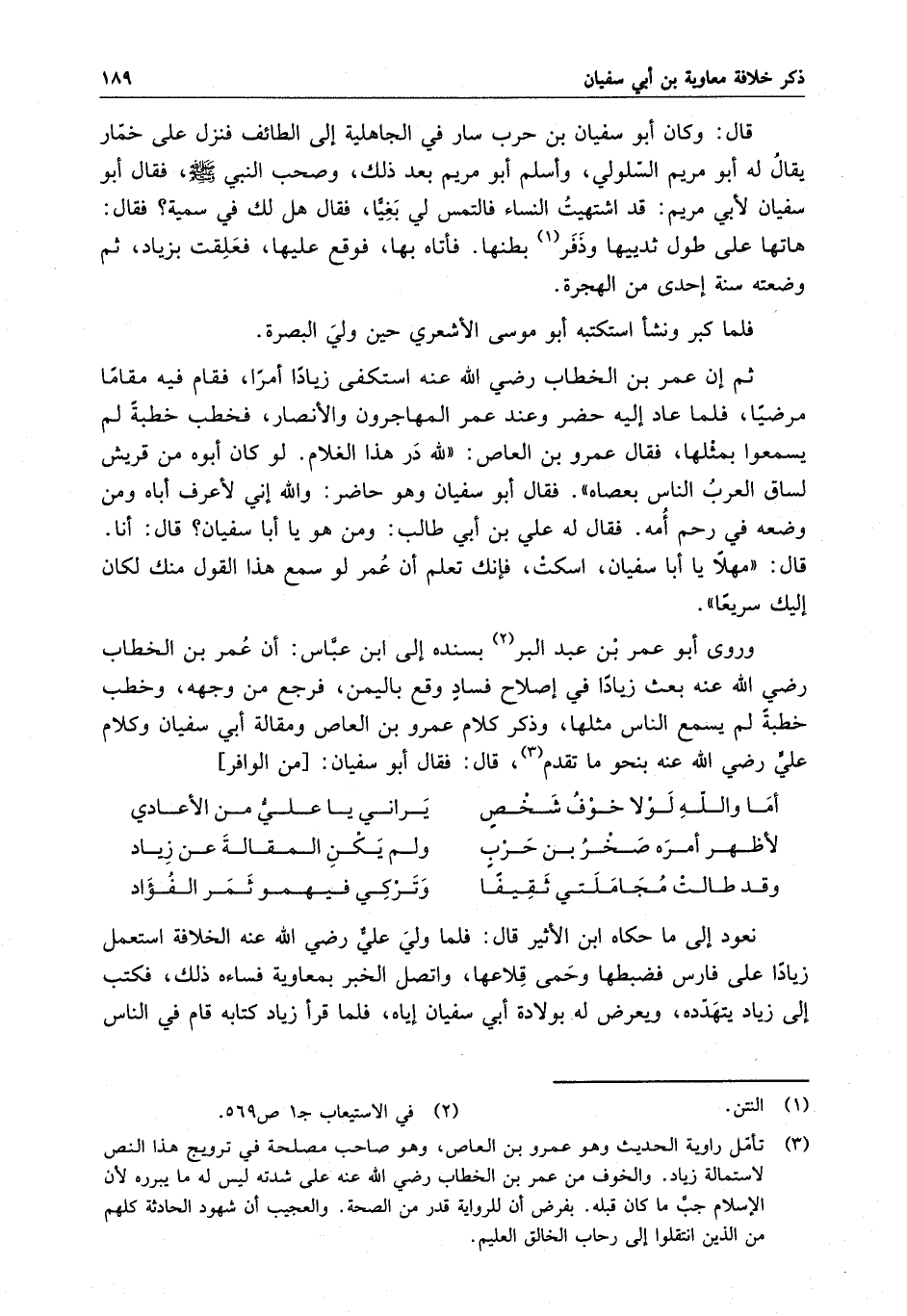 وروى أبو عمر ابن عبد البر بسنده إلى ابن عباس : أن عمر بن الخطاب رضي الله عنه بعث زياداً في إصلاح فساد وقع باليمن ، فرجع من وجهه ، وخطب خطبة لم يسمع الناس مثلها " وذكر كلام عمرو بن العاص ومقالة أبي سفيان وكلام علي رضي الله عنه بنحو ما تقدم " قال : فقال أبو سفيان :