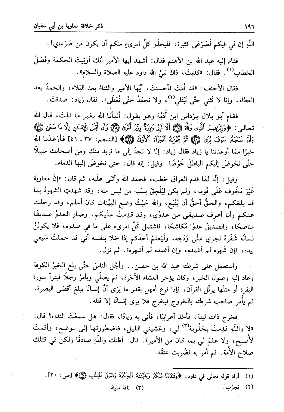 فقام أبو بلال مرداس بن أدية وهو يقول : أنبأنا الله بغير ما قلت ، قال الله تعالى : " وإبراهيم الذي وفى ، ألا تزر وازرة وزر أخر ، وأن ليس للإنسان إلا ما سعى وأن سعيه سوف يرى ، ثم يجزاه الجزاء الأوفى " فأوعدنا الله خيراً مما أوعدتنا يا زياد فقال زياد : إنا لا نجد إلى ما نريد منك ومن أصحابك سبيلاً حتى نخوض إليكم الباطل خوضاً وقيل : إنه قال : حتى نخوض إليها الدماء .
