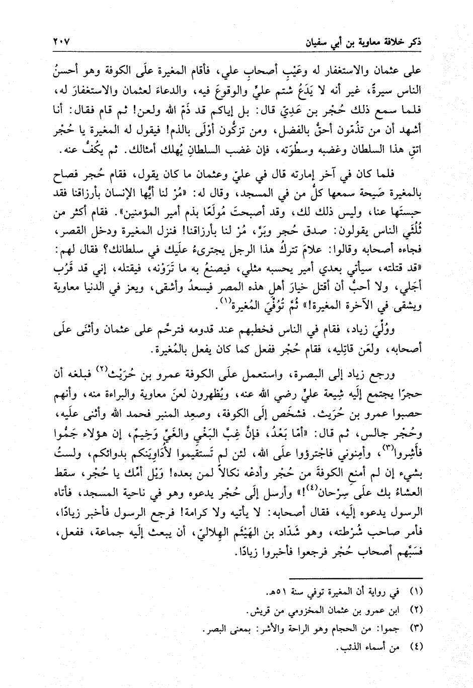 على عثمان والاستغفار له وعيب أصحاب علي ، فأقام المغيسرة على الكوفة وهوأحسن الناس سيرة ، غير أنه لا يدع شتم علي والوقوع فيه والدعاء لعثمان والاستغفار له ، فلما سمع ذلك حجر بن عدي قال : بل إياكم قد ذم الله ولعن ثم قام فقال : أنا أشهد أن من تذمون أحق بالفضل ، ومن تزكون أولى بالذم فيقول له المغيرة يا حجر اتق هذا السلطان وغضبه وسطوته ، فإن غضب السلطان يهلك أمثالك ، ثم يكف عنه .