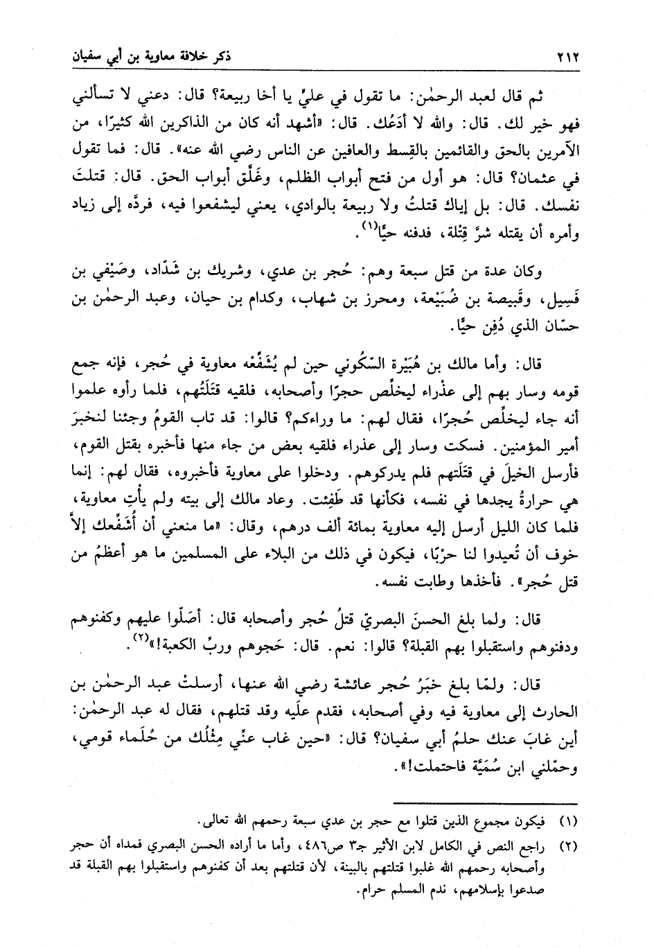 قال : ولما بلغ الحسن البصري قتل حجر وأصحابه قال : أصلوا عليهم وكفنوهم ودفنوهم واستقبلوا بهم القبلة ؟ قالوا : نعم . قال : حجوهم ورب الكعبة " .