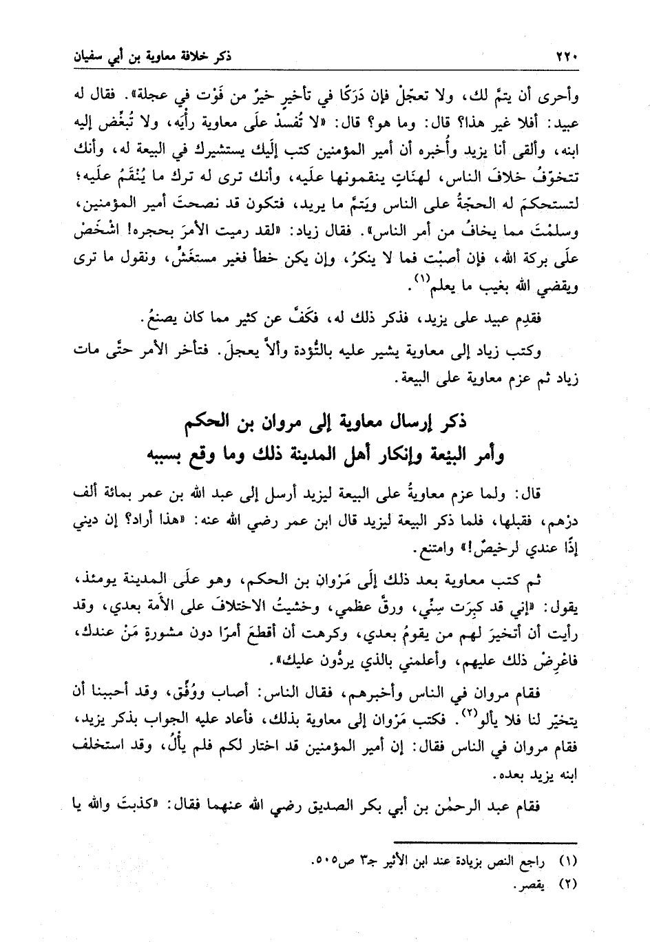 قال : ولما عزم معاوية على البيعة ليزيد أرسل إلى عبد الله بن عمر بمئة ألف درهم ، فقبلها ، فلما ذكر البيعة ليزيد قال ابن عمر رضي الله عنه : " هذا أراد ؟ إن ديني إذاً عندي لرخيص " وامتنع . ثم كتب معاوية بعد ذلك إلى مروان بن الحكم ، وهو على المدينة يومئذ ، يقول : " إني قد كبرت سني ، ورق عظمي ، وخشيت الاختلاف على الأمة بعدي ، وقد رأيت أن أتخير لهم من يقوم بعدي ، وكرهت أن أقطع أمراً دون مشورة من عندك ، فاعرض ذلك عليهم ، وأعلمني بالذي يردون عليك " .