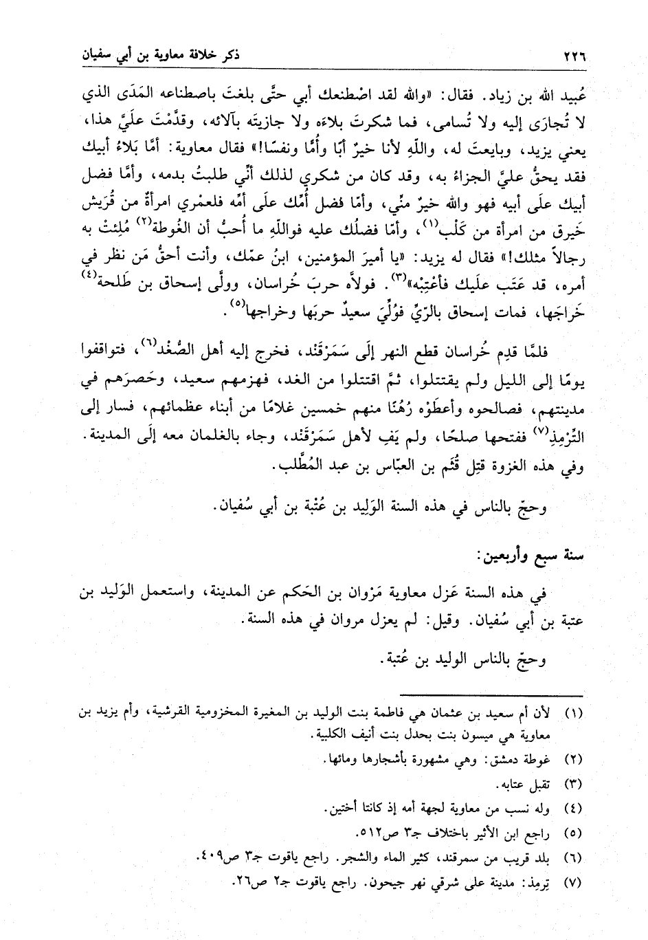 عبيد الله بن زياد . فقال : " والله لقد اصطنعك أبي حتى بلغت باصطناعه المدى الذي لا تجارى إليه ولا تسامى ، فما شكرت بلاءه ولا جازيته بآلائه ، وقدمت على هذا - يعني يزيد - وبايعت له ، والله لأنا خيرٌ أباً وأماً ونفسا " فقال معاوية : أما بلاء أبيك فقد يحق على الجزاء به ، وقد كان من شكري لذلك أني قد طلبت بدمه ، وأما فضل أبيك على أبيه فهو والله خيرٌ مني ، وأما فضل أمك على أمه فلعمري امرأة من قريش خير من امرأة من كلب ، وأما فضلك عليه فوالله ما أحب أن الغوطة ملئت به رجالاً مثلك " فقال له يزيد : " يا أمير المؤمنين ، ابن عمك ، وأنت أحق من نظر في أمره ، قد عتب عليك فأعتبه " . فولاه حرب خراسان ، وولى إسحاق ابن طلحة خراجها ، فمات إسحاق بالري فولى سعيد حربها وخراجها .