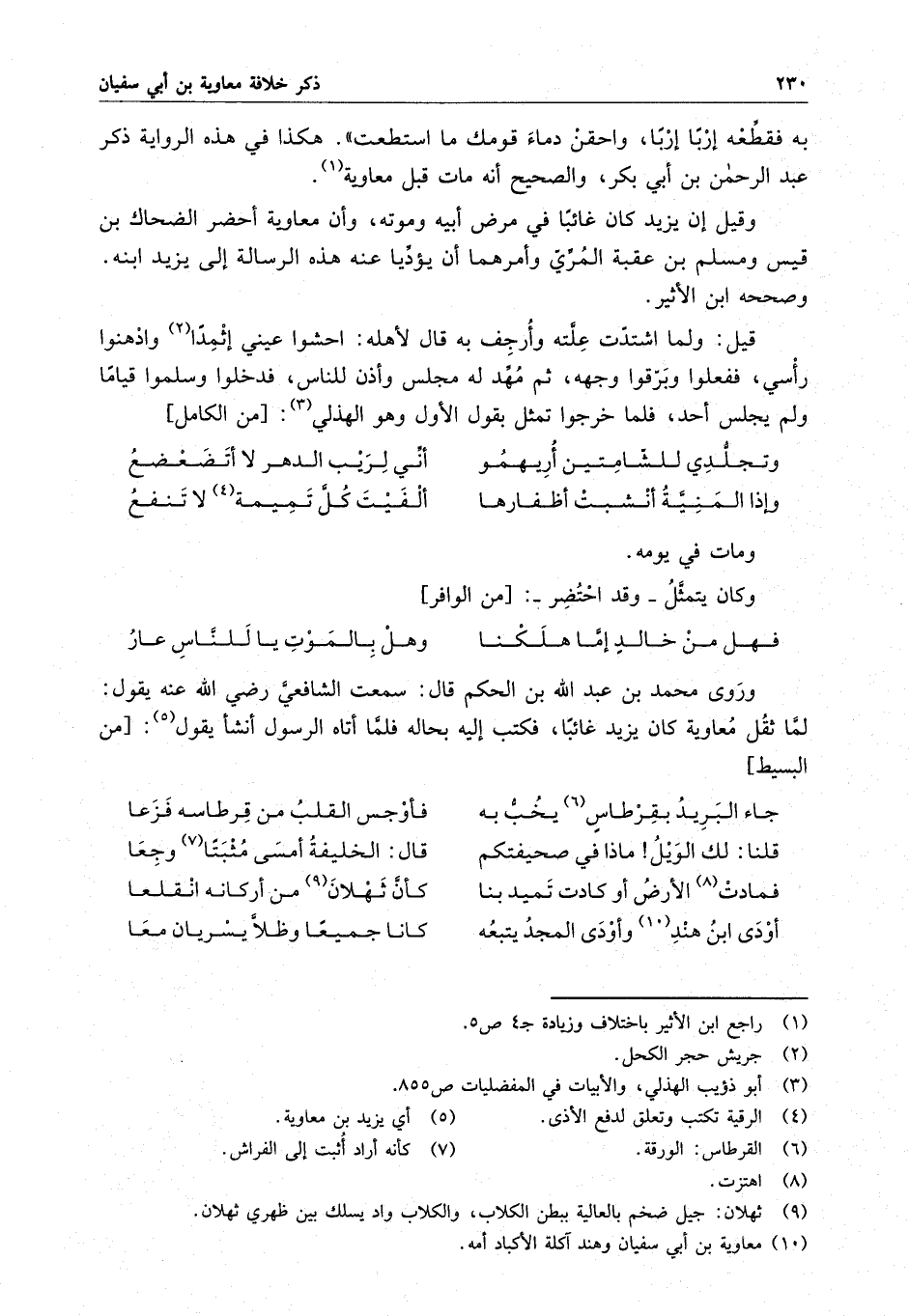 وروى محمد بن عبد الله بن الحكم قال : سمعت الشافعي رضي الله عنه يقول : لما ثقل معاوية كان يزيد غائباً ، فكتب إليه بحاله فلما أتاه الرسول أنشأ يقول :