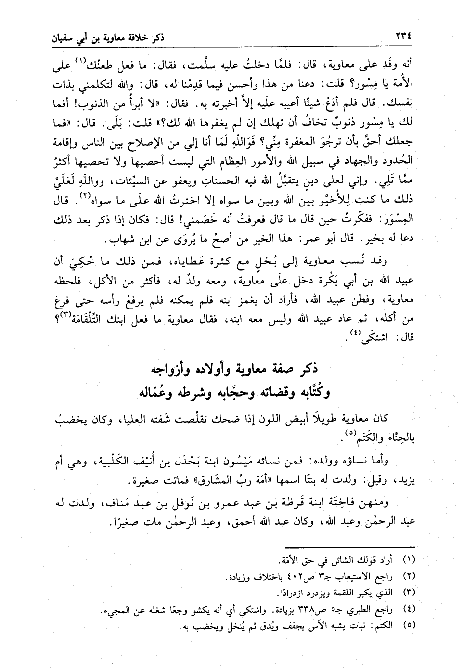 ذكر صفة معاوية وأولاده وأزواجه وكتابه وقضاته وحجابه وشرطه وعماله