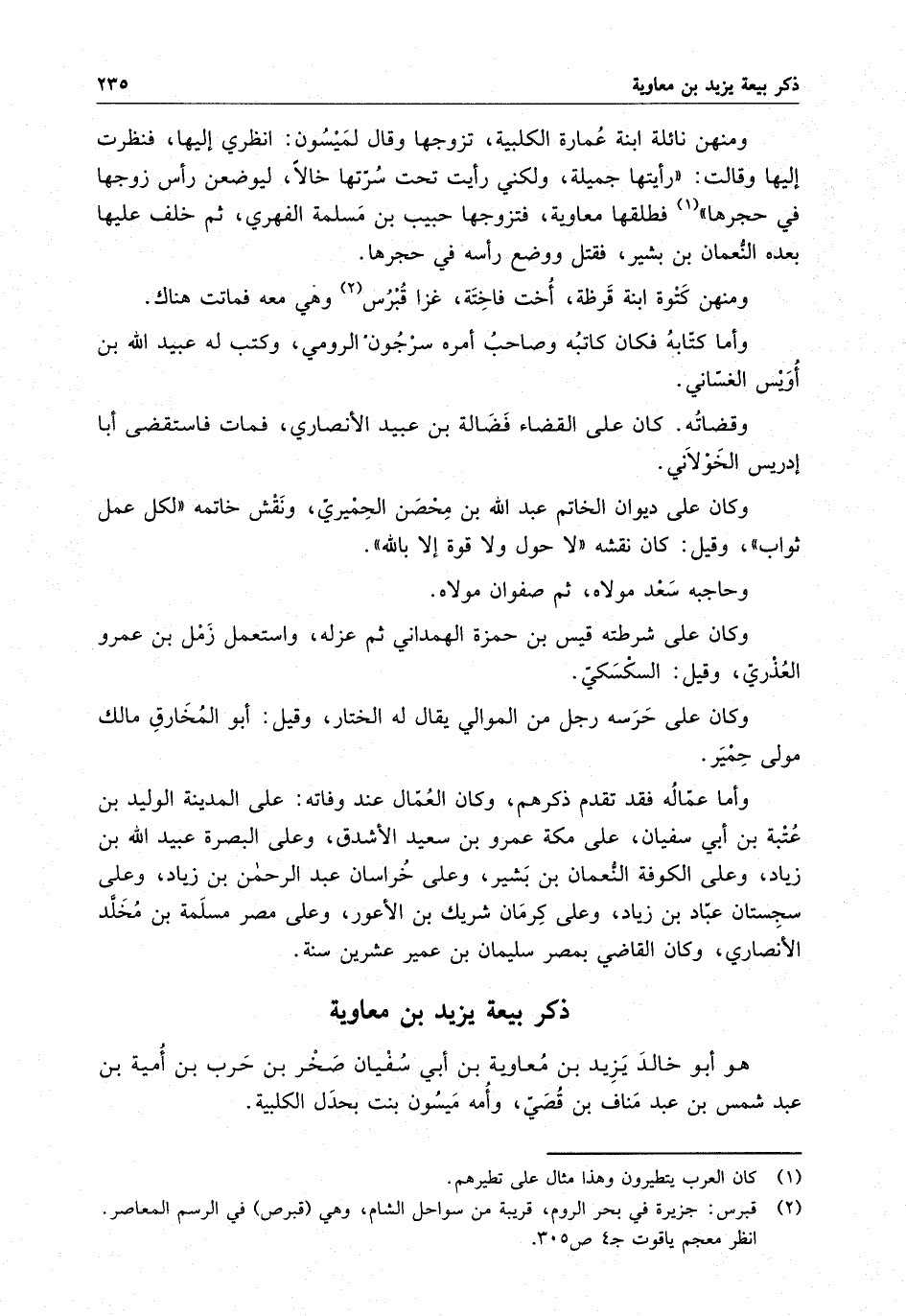 وأما عماله فقد تقدم ذكرهم ، وكان العمال عند وفاته : على المدينة الوليد بن عتبة بن أبي سفيان ، على مكة عمرو بن سعيد الأشدق ، وعلى البصرة عبيد الله بن زياد ، وعلى الكوفة النعمان بن بشير ، وعلى خراسان عبد الرحمن بن زياد ، وعلى سجستان عباد بن زياد ، وعلى كرمان شريك بن الأعور ، وعلى مصر مسلمة بن مخلد الأنصاري ، وكان القاضي بمصر سليمان بن عمير عشرين سنة .