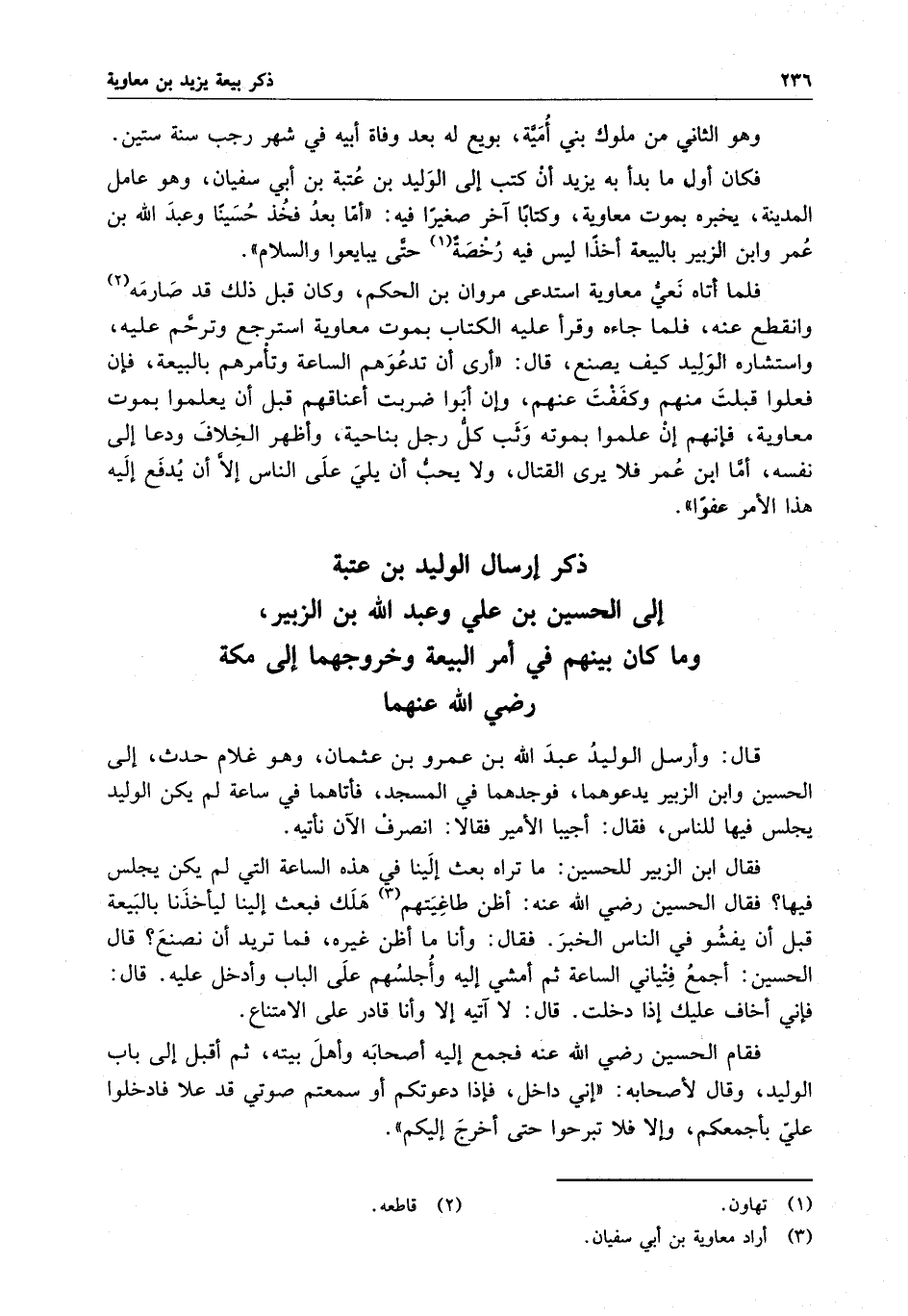 ذكر إرسال الوليد بن عتبة إلى الحسين بن علي وعبد الله بن الزبير ، وما كان بينهم في أمر البيعة وخروجهما إلى مكة رضي الله عنهما