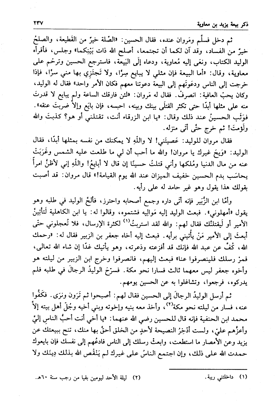 ثم دخل فسلم ومروان عنده ، فقال الحسين : " الصلة خير من القطيعة ، والصلح خير من الفساد ، وقد آن لكما أن تجتمعا ، أصلح الله ذات بينكما " وجلس ، فأقرأه الوليد الكتاب ، ونعى إليه معاوية ، ودعاه إلى البيعة ، فاسترجع الحسين وترحم على معاوية ، وقال : " أما البيعة فغن مثلي لا يبايع سراً ، ولا تجتزي بها مني سراً ، فإذا خرجت إلى الناس ودعوتهم إلى البيعة دعوتنا معهم فكان الأمر واحد " فقال له الوليد - وكان يحب العافية - انصرف .
