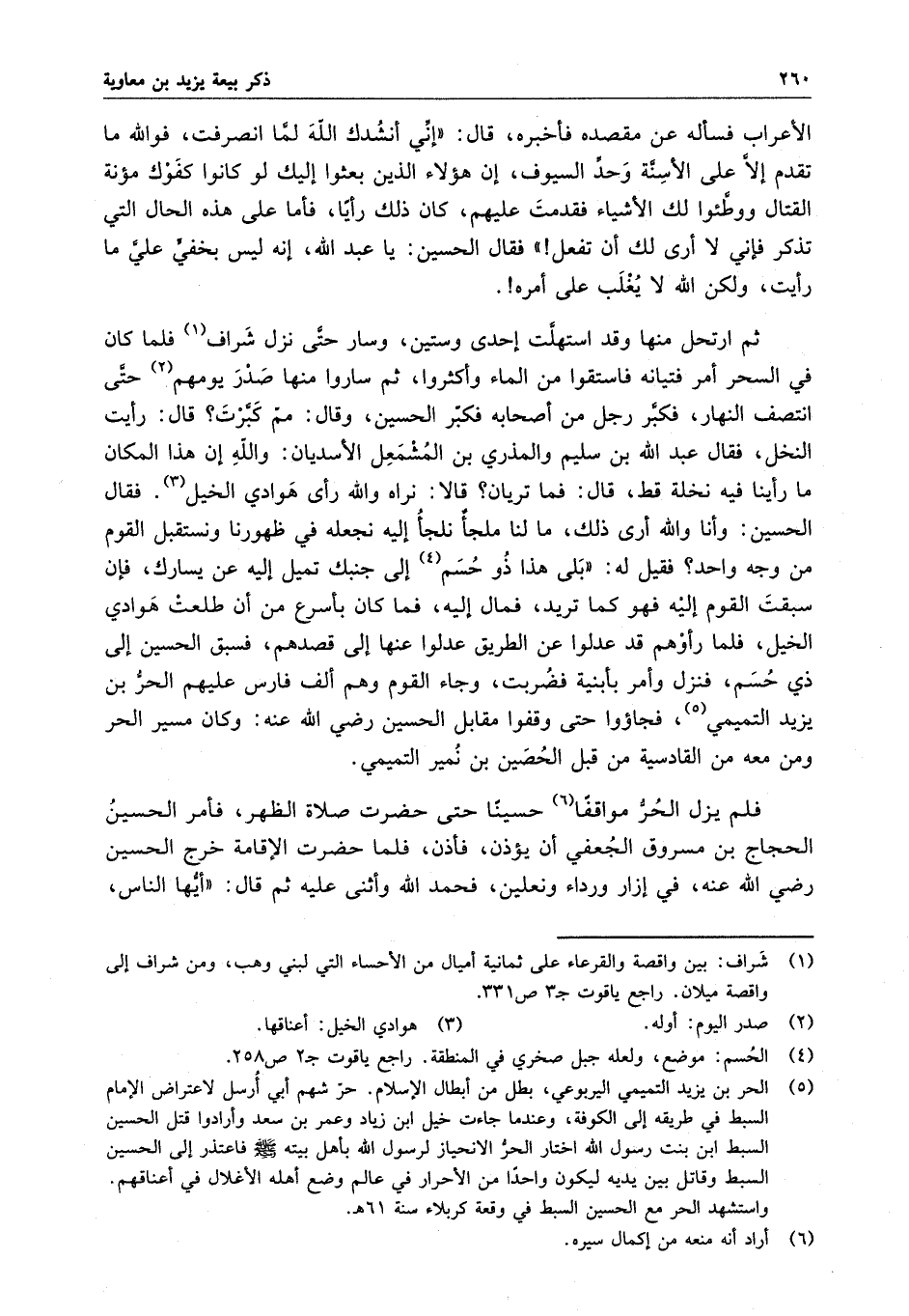 ثم ارتحل منها وقد استهلت إحدى وستين ، وسار حتى نزل شراف فلما كان في السحر أمر فتيانه فاستقوا من الماء وأكثروا ، ثم ساروا منها صدر يومهم حتى انتصف النهار ، فكبر رجل من أصحابه فكبر الحسين ، وقال : مما كبرت ؟ قال : رأيت النخل ، فقال عبد الله بن سليم والمذري بن المشمعل الأسديان : والله عن هذا المكان ما رأينا فيه نخلة قط ، فقال : فما تريان . قالا : نراه والله رأى هوادي الخيل . فقال الحسين : وأنا والله أرى ذلك ، ما لنا ملجأ نلجأ إليه نجعله في ظهورنا ونستقبل القوم من وجه واحد ؟ فقيل له : " بلى هذا ذو حسم إلى جنبك تميل إليه عن يسارك ، فإذا سبقت القوم إليه فهو كما تريد ، فمال إليه ، فما كان بأسرع من أن طلعت هوادي الخيل ، فلما رأوهم قد عدلوا عن الطريق عدلوا عنها إلى قصدهم ، فسبق الحسين إلى ذي حسم فنزل وأمر بأبنية فضربت ، وجاء القوم وهم ألف فارس عليهم الحر بن يزيد التميمي ، فجاءوا حتى وقفوا مقابل الحسين رضي الله عنه : وكان مسير الحر ومن معه من القادسية من قبل الحصين بن نمير التميمي .