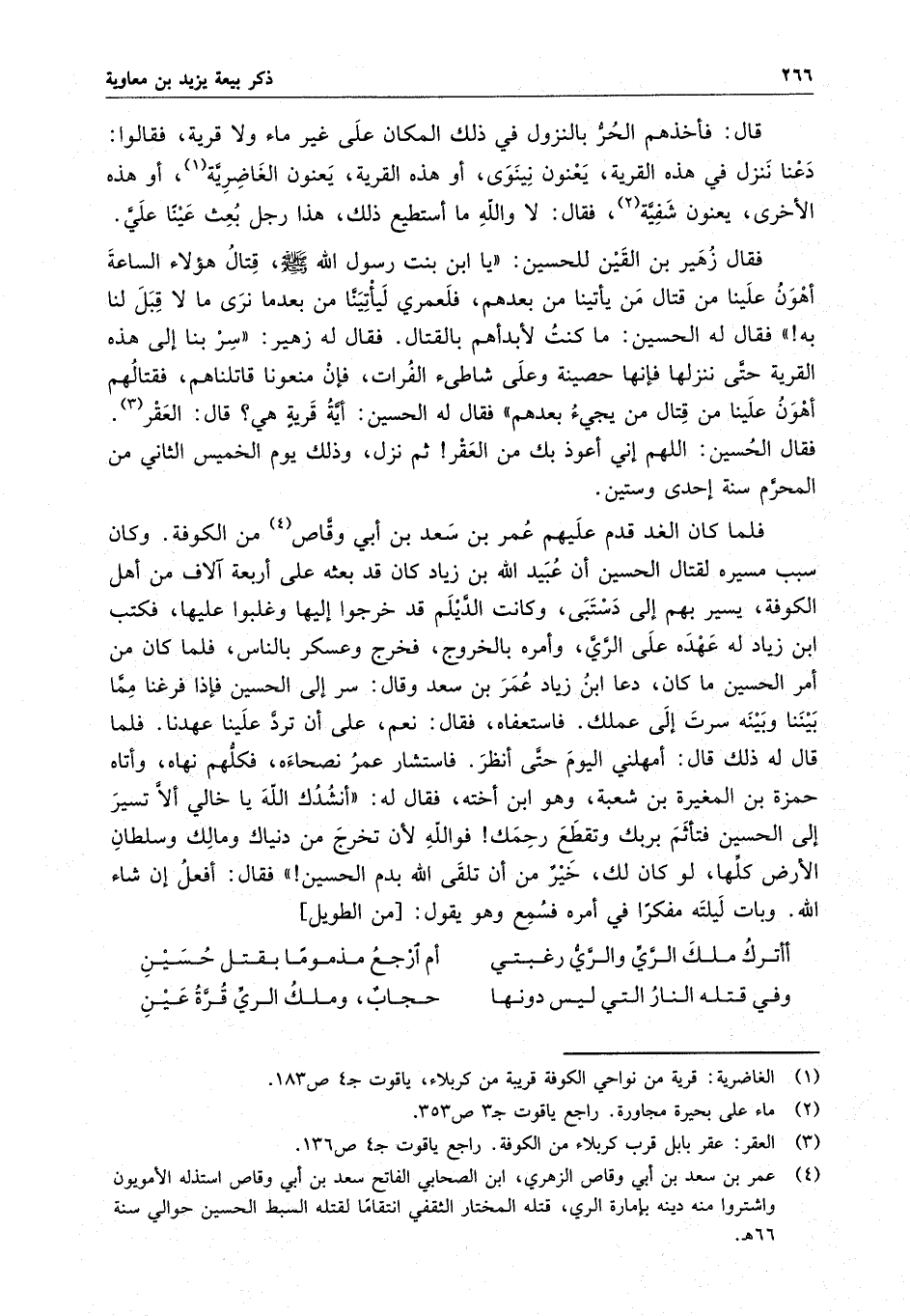 قال : فأخذهم الحر بالنزول في ذلك المكان على غير ماء ولا قرية ، فقالوا : دعنا ننزل في هذه القرية يعنون نينوي أو هذه القرية يعنون الغاضرية أو هذه الأخرى يعنون شفية . فقال : لا والله ما أستطيع ذلك ، هذا رجل بعث عيناً علي . فقال زهير بن القين للحسين : " يا ابن بنت رسول الله ( صلى الله عليه وسلم ) ، قتال هؤلاء الساعة أهون علينا من قتال من يأتينا من بعدهم ، فلعمري ليأتينا من بعدما نرى ما لا قبل لنا به " فقال له الحسين : ما كنت لأبدأهم بالقتال . فقال له زهير : " سربنا إلى هذه القرية حتى ننزلها فإنها حصينة وعلى شاطئ الفرات ، فإن منعونا قاتلناهم ، فقتالهم أهون علينا من قتال من يجئ بعدهم " . فقال له الحسين : أية قريةٍ هي ؟ قال : العقر . فقال الحسين : اللهم إني أعوذ بك من العقر ثم نزل ، وذلك يوم الخميس الثاني من المحرم سنة إحدى وستين .