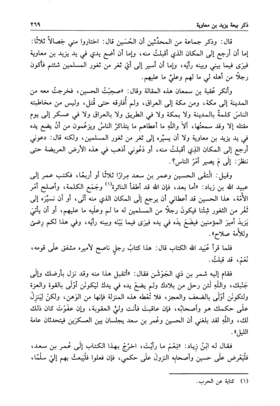 قال : وذكر جماعة من المحدثين أن الحسين قال : اختاروا مني خصالا ثلاثا : إما أن أرجع إلى المكان الذي أقبلت منه ، وإما أن أضع يدي في يد يزيد بن معاوية فيرى فيما بيني وبينه رأيه ، وإما أن أسير إلى أي ثغر من ثغور المسلمين شئتم فأكون رجلا من أهله لي ما لهم وعلي ما عليهم .