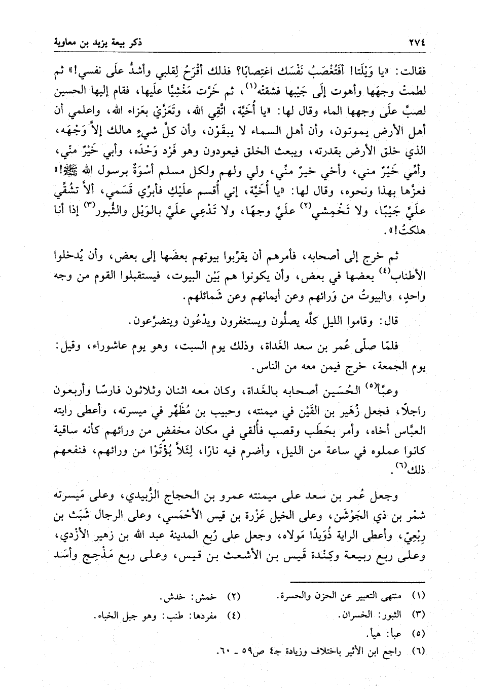 فقالت : " يا ويلتاه أفتغضب نفسك اغتصاباً ؟ فذلك أقرح لقلبي وأشد على نفسي " . ثم لطمت وجهها وأهوت إلى جيبها فشقته ، ثم خرت مغشياً عليه ، فقام إليها الحسين فصب على وجها الماء وقال لها : " يا أخيه ، اتق الله ، وتعزي بعزاء الله واعلمي أن أهل الأرض يموتون ، وأن أهل السماء لا يبقون ، وأن كل شيءٍ هالك إلا وجهه ، الذي خلق الأرض بقدرته ، ويبعث الخلق فيعودون وهو فرد وحده ، وأبي خيرٌ مني ، وأمي خيرٌ مني ، وأخي خيرٌ مني ، ولي ولهم ولكل مسلم أسوة برسول الله ( صلى الله عليه وسلم ) " . فعزاها بهذا ونحوه ، وقال لها : " يا أخيه ، إني أقسم عليك فأبري قسمي ، أن لا تشقي علي جيباً ، ولا تخمشي علي وجها ، ولا تدعي علي بالويل والثبور إذا أنا هلكت " . ثم خرج إلى أصحابه ، فأمرهم أن يقربوا بيوتهم بعضها إلى بعض ، وأن يدخلوا الأطناب بعضها في بعض ، وأن يكونوا هم بين البيوت ، فيستقبلوا القوم من وجه واحد ، والبيوت من ورائهم وعن أيمانهم وعن شمائلهم .