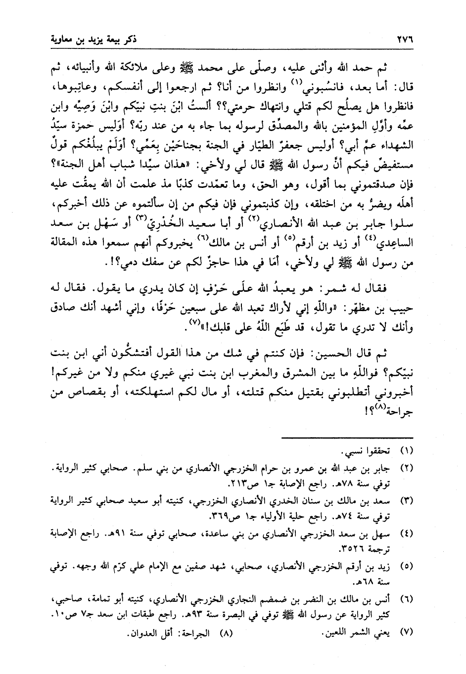 ثم حمد الله وأثنى عليه ، وصلى على محمد ( صلى الله عليه وسلم ) وعلى ملائكة الله وأنبيائه ، ثم قال : أما بعد ، فانسبوني وانظروا من أنا ؟ ثم ارجعوا إلى أنفسكم ، وعاتبوها ، فانظروا هل يصلح لكم قتلي وانتهاك حرمتي ؟ ألست ابن بنت نبيكم وابن وصيه وابن عمه وأول المؤمنين بالله والمصدق لرسوله بما جاء به من عند ربه ؟ أوليس حمزة سيد الشهداء عم أبي ؟ أوليس جعفر الطيار في الجنة بجناحين بعمي ؟ أولم يبلغكم قول مستفيض فيكم أن رسول الله ( صلى الله عليه وسلم ) قال لي ولأخي : " هذان سيدا شباب أهل الجنة " ؟ فإن صدقتموني بما أقول ، وهو الحق ، وما تعمدت كذباً مذ علمت أن الله يمقت عليه أهله ويضر به من اختلقه ، وإن كذبتموني فإن فيكم من إن سألتموه عن ذلك أخبركم ، سلوا جابر بن عبد الله الأنصاري أو أبا سعيد الخدري أو سهل بن سعد الساعدي أو زيد بن أرقم أو أنس بن مالك يخبروكم أنهم سمعوا هذه المقالة من رسول الله ( صلى الله عليه وسلم ) لي ولأخي ، أما في هذا حاجز لكم عن سفك دمي ؟ .