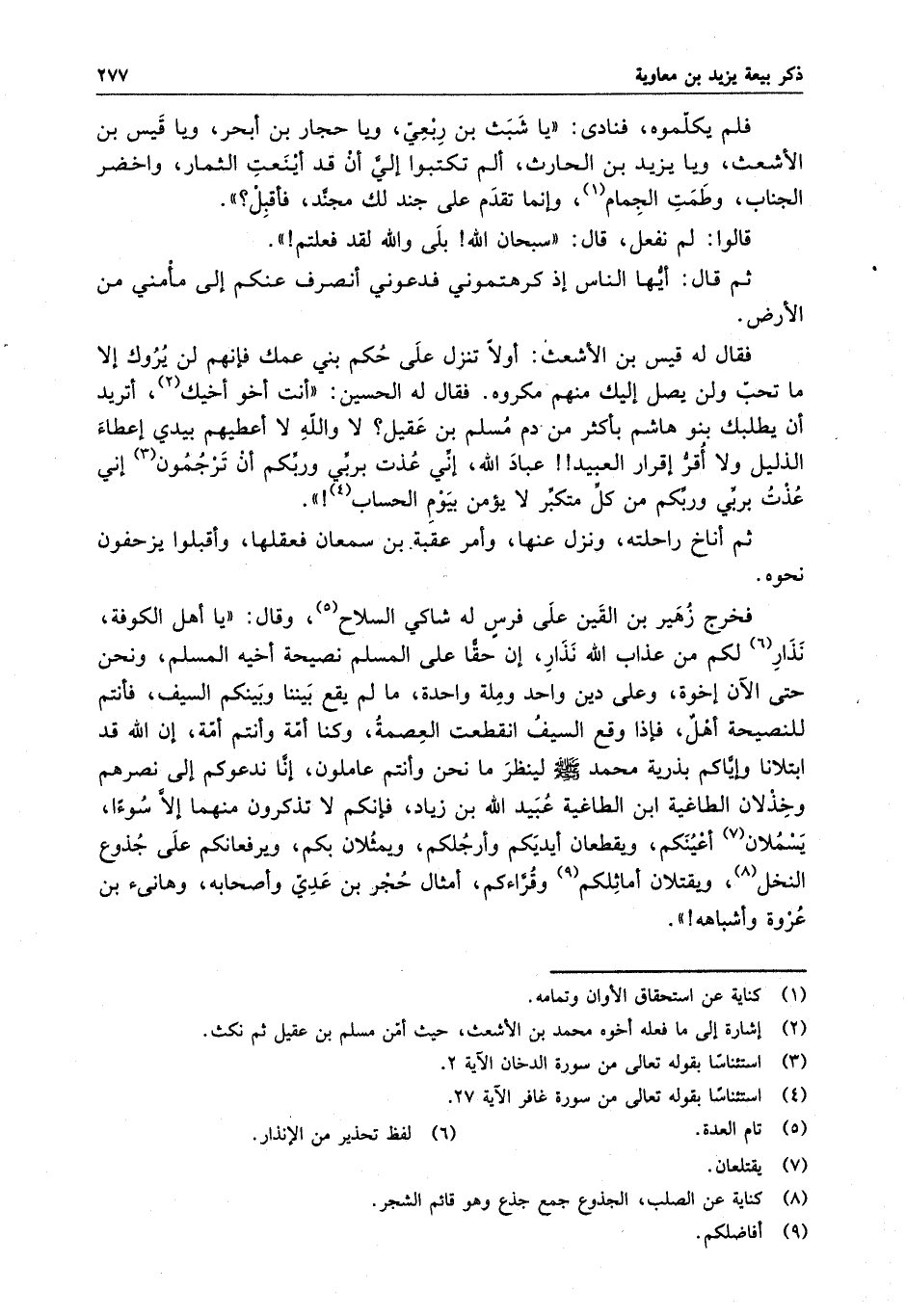فخرج زهير بن القين على فرس له شاكي السلاح ، وقال : " يا أهل الكوفة ، نذار لكم من عذاب الله نذار ، إن حقاً على المسلم نصيحة أخيه المسلم ، ونحن حتى الآن أخوة ، وعلى دين واحد وملة واحدة ، ما لم يقع بيننا وبينكم السيف ، فأنتم للنصيحة أهل ، إن الله قد ابتلانا وإياكم بذرية محمد ( صلى الله عليه وسلم ) لينظر ما نحن وأنتم عاملون ، إنا ندعوكم إلى نصرهم وخذلا ن الطاغية ابن الطاغية عبيد الله بن زياد فإنكم لا تذكرون منهما إلا سوءا ، يسملان أعينكم ، وقطعان أيديكم وأرجلكم ، ويمثلان بكم ، ويرفعانكم على جذوع النخل ويقتلان أماثلكم وقراءكم ، أمثال حجر بن عدي وأصحابه ، وهانئ بن عروة وأشباهه "