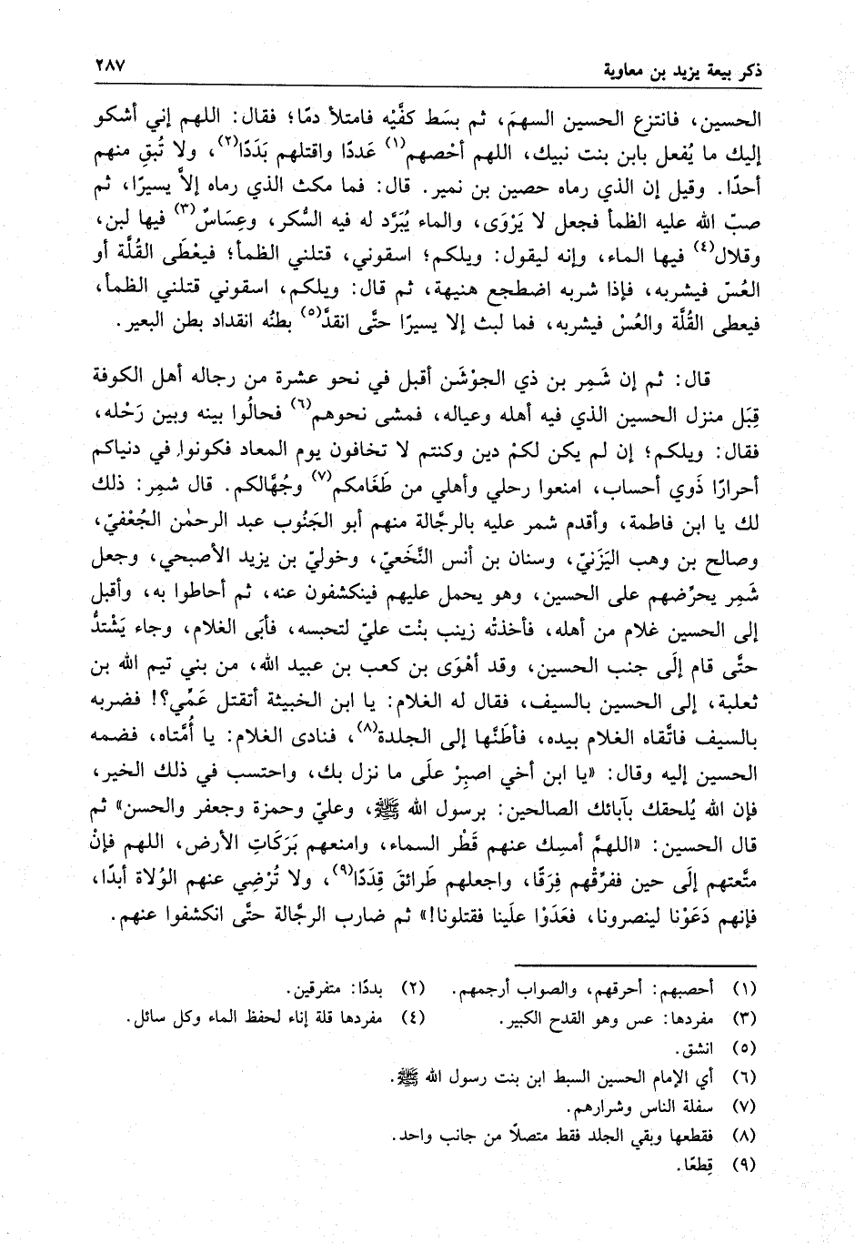 فانتزع الحسين السهم ، ثم بسط كفيه فامتلأ دماً ، فقال اللهم إني أشكو إليكما يفعل بابن بنت نبيك ، اللهم أحصهم عدداً واقتلهم بدداً ، ولا تبق منهم أحداً ، وقيل أن الذي رماه حصينا بن نمير ، قال : فما مكث الذي رماه إلا يسيراً ، ثم صب الله عليه الظمأ فجعل لا يروى ، والماء يبرد له فيه السكر ، وعساسٌ فيها لبن ، وقلال فيها الماء ، وإنه ليقول : ويلكم ، اسقوني ، قتلني الظمأ ، فيعطى القلة والعس فيشربه ، فما لبث إلا يسيراً حتى انقد بطنه انقداد بطن البعير . قال : ثم إن شمر بن ذي الجوشن أقبل في نحو عشرة من رجاله أهل الكوفة قبل منزل الحسين الذي فيه أهله وعياله ، فمشى نحوهم فحالوا بينه وبين رحله ، فقال : ويلكم ، إن لم يكن لكم دين وكنتم لا تخافون يوم المعاد فكونوا في دنياكم أحراراً ذوي أحساب ، امنعوا رحلي وأهلي من طعامكم وجهالكم . قال شمر : ذلك لك يا ابن فاطمة ، وأقدم شمر عليه بالرجالة منهم أبو الجنوب عبد الرحمن الجعفي ، وصالح بن وهب اليزني ، وسنان بن أنس النخعي ، وخولى بن يزيد الأصبحي ، وجعل شمر يحرضهم على الحسين ، وهو يحمل عليهم فينكشفون عنه ، ثم أحاطوا به ، وأقبل إلى الحسين غلام من أهله ، فأخذته زينب بنت علي لتحبسه ، فأبى الغلام ، وجاء يشتد حتى قام إلى جنب الحسين ، وقد أهوى ابن كعب بن عبيد الله " من بني تيم الله بن ثعلبة " إلى الحسين بالسيف ، فقال له الغلام : يا ابن الخبيثة أتقتل عمي ؟ فضربه بالسيف فاتقاه الغلام بيده ، فأطنها إلى الجلدة ، فنادى الغلام : يا أمتاه ، فضمه الحسين إليه وقال : " يا ابن أخي اصبر على ما نزل بك ، واحتسب في ذلك الخير ، فإن الله يلحقك بآبائك الصالحين ، برسول الله صلى عليه وسلم ، وعلى حمزة وجعفر والحسن " ثم قال الحسين : " اللهم أمسك عنهم قطر السماء ، وامنعهم بركات الأرض ، اللهم فإن متعتهم إلى حين ففرقهم فرقا ، واجعلهم طرائق قددا ، ولاترضي عنهم الولاة أبدا ، فإنهم دعونا لينصرونا ، فعدوا علينا فقتلونا " ثم ضارب الرجالة حتى انكشفوا عنهم .