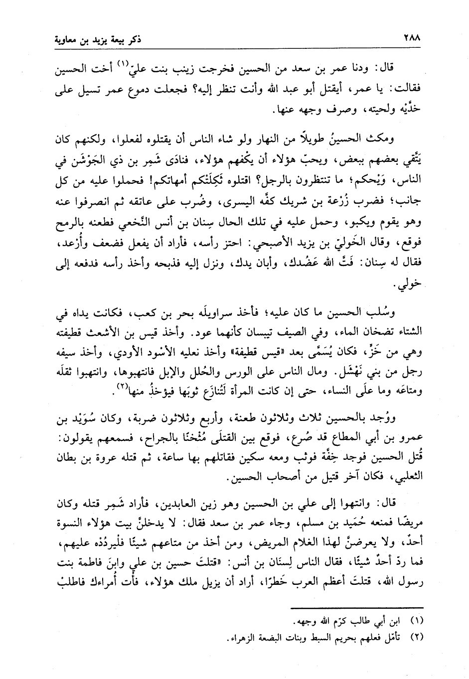 قال : وانتبهوا إلى علي بن الحسين وهو زين العابدين ، فأراد شمر قتله وكان مريضاً فمنعه حميد بن مسلم ، وجاء عمر بن سعد فقال : لايدخلن بيت هؤلاء النسوة أحد ، ولايعرضن لهذا الغلام المريض ، ومن أخذ من متاعهم شيئاً فليردده عليهم ، فما رد أحد شيئاً ، فقال الناس لسنان بن أنس : " قتلت حسين بن علي وابن فاطمة بنت رسول الله ، قتلت أعظم الناس خطراً ، أراد أن يزيل ملك هؤلاء ، فأت أمراءك فاطلب
