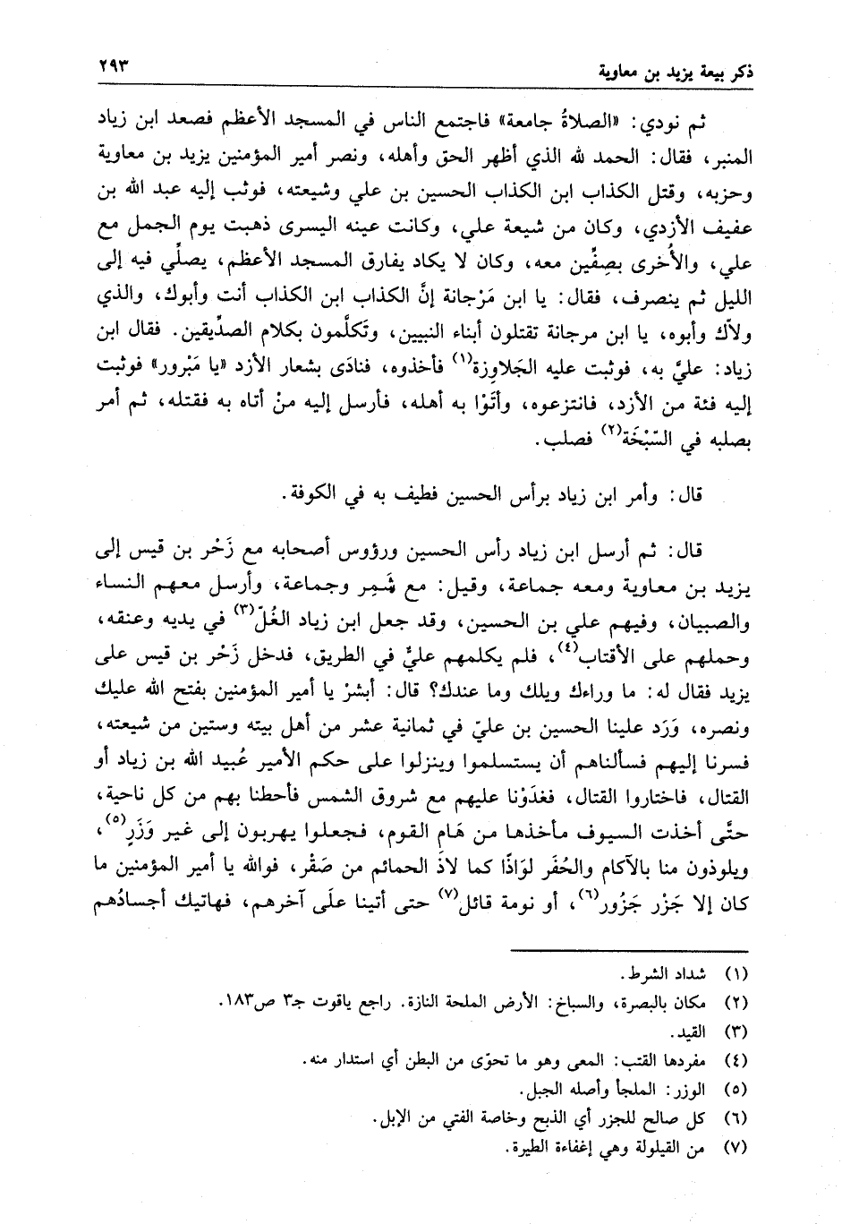 قال : وأمر ابن زياد برأس الحسين فطيف به في الكوفة . قال : ثم أرسل ابن زياد رأس الحسين ورؤوس أصحابه مع زحر ابن قيس إلى يزيد بن معاوية ومعه جماعة ، وقيل : مع شمر وجماعة ، وأرسل معهم النساء والصبيان ، وفيهم علي بن الحسين ، وقد جعل ابن زياد الغل في يديه وعنقه ، وحملهم على الأقتاب ، فلم يكلمهم عليٌ في الطريق ، فدخل زحر بن قيس على يزيد فقال له : ما وراءك ويلك وما عندك ؟ قال : أبشر يا أمير المؤمنين بفتح الله عليك ونصره ، ورد علينا الحسين بن على مع ثمانية عشر من أهل بيته وستين من شيعته ، فسرنا إليهم فسألناهم أن يستسلموا وينزلوا على حكم الأمير عبيد الله بن زياد أو القتال ، فاختاروا القتال ، فغدونا عليهم مع شروق الشمس فأحطنا بهم من كل ناحية ، حتى أخذت السيوف مأخذها من هام القوم ، فجعلوا يهربون إلى غير وزرٍ ، ويلوذون منا بالآكام والحفر لواذاً كما لاذ الحمائم من صقر ، فو الله يا أمير المؤمنين ما كان إلا جزر جزور ، أو نومة قائل حتى أتينا على آخرهم ، فهاتيك أجسادهم