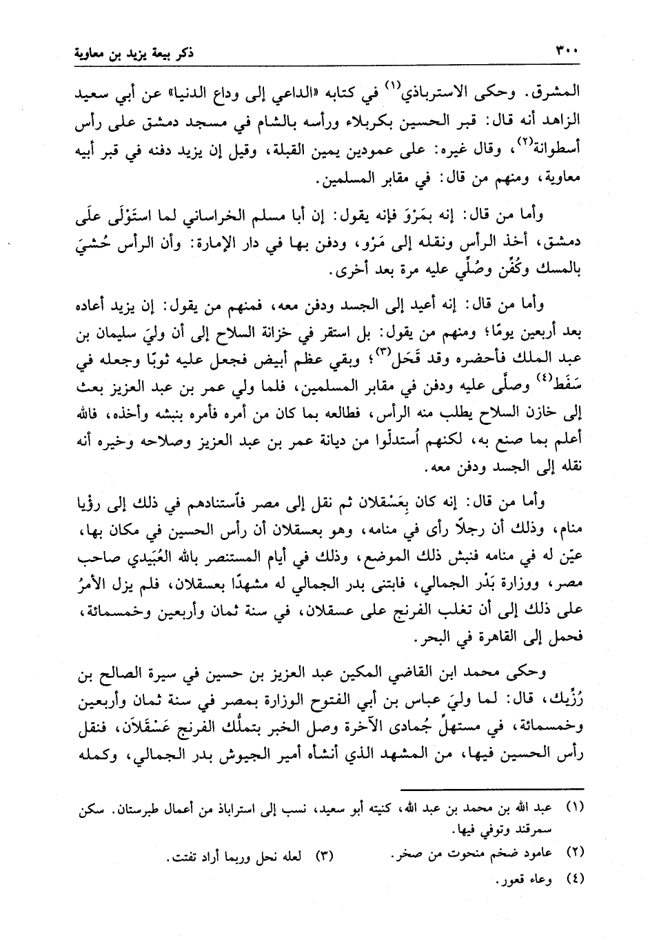 المشرق . وحكى الاستربازي في كتابه " الداعي إلى وداع الدنيا " عن أبي سعيد الزاهد أنه قال : قبر الحسين بكربلاء ورأسه بالشام في مسجد دمشق على رأس أسطوانة ، وقال غيره : على عمودين يمين القبلة ، وقيل أن يزيد دفنه في قبر أبيه معاوية ، ومنهم من قال : في مقابر المسلمين . وأما من قال : إنه بمرو فإنه يقول : إن أبا مسلم الخرساني لما استولى على دمشق ، أخذ الرأس ونقله إلى مرو ، ودفن بها في دار الإمارة ، وأن الرأس حشي بالمسك وكفن وصلي عليه مرة بعد أخرى .