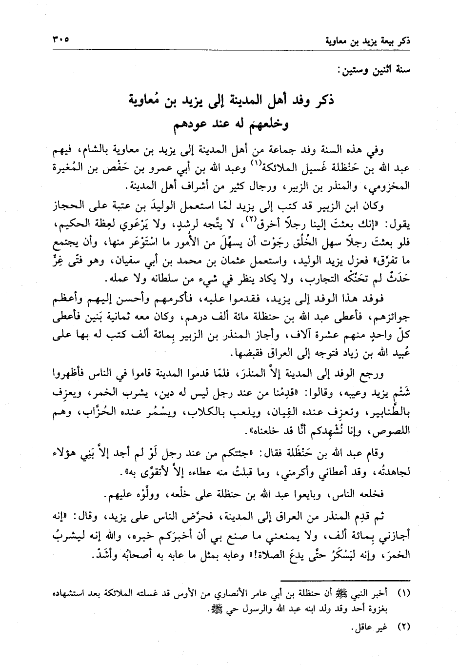 وفي هذه السنة وفد جماعة من أهل المدينة إلى يزيد بن معاوية بالشام ، فيهم عبد الله بن حنظلة غسيل الملائكة وعبد الله بن أبي عمرو بن حفص بن المغيرة المخزومي ، والمنذر بن الزبير ، ورجال كثير من أشراف أهل المدينة .