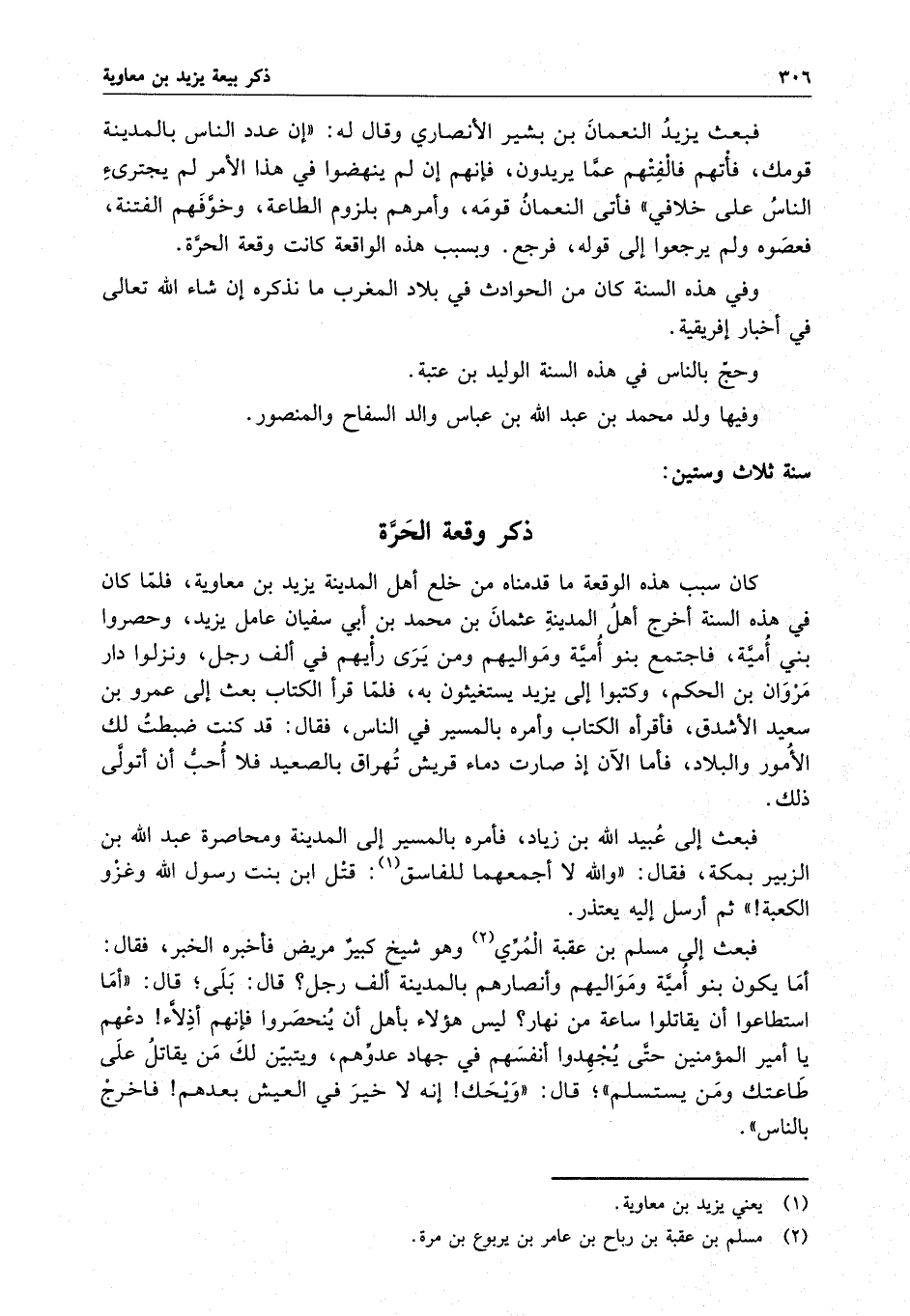 فبعث يزيد النعمان بن بشير الأنصاري وقال له : " إن عدد الناس بالمدينة قومك ، فأتهم فالفتهم عما يريدون ، فإنهم إن لم ينهضوا في هذا الأمر لم يجترئ الناس على خلافي " . فأتى النعمان قومه ، وأمرهم بلزوم الطاعة ، وخوفهم الفتنة ، فعصوه ولم يرجعوا إلى قوله ، فرجع . وبسبب هذه الواقعة كانت وقعة الحرة . وفي هذه السنة كان من الحوادث في بلاد المغرب ما نذكره إن شاء الله تعالى في أخبار أفريقية . وحج بالناس في هذه السنة الوليد بن عتبة . وفيها ولد محمد بن عبد الله بن عباس والد السفاح والمنصور .