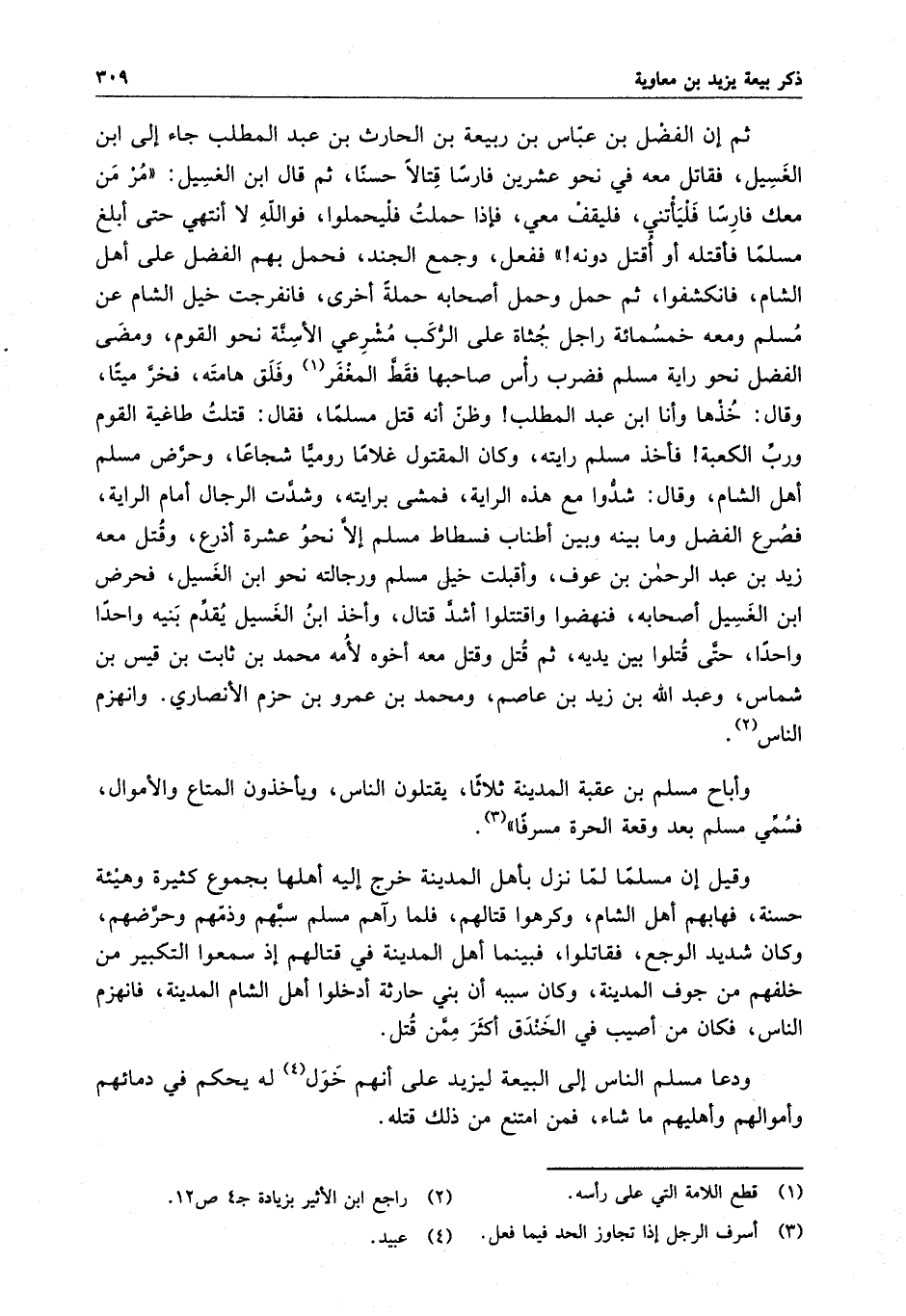 وأباح مسلم بن عقبة المدينة ثلاثا ، يقتلون الناس ، ويأخذون المتاع والأموال ، فسمي مسلم بعد وقعة الحرة مسرفاً " .