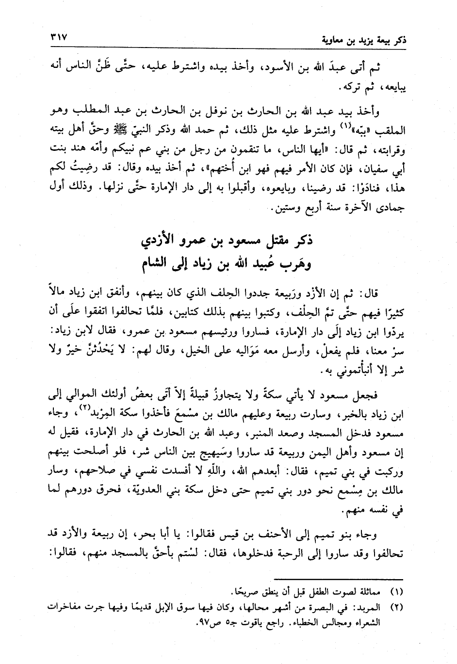 قال : ثم إن الأزد وربيعة جددوا الحلف الذي كان بينهم ، وأنفق ابن زياد مالاً كثيراً فيهم حتى تم الحلف ، وكتبوا بينهم بذلك كتابين ، فلما تحالفوا اتفقوا على أن يردوا ابن زياد إلى دار الإمارة ، فساروا ورئيسهم مسعود بن عمرو ، فقال لابن زياد : سر معنا ، فلم يفعل ، وأرسل معه مواليه على الخيل ، وقال لهم لا يحدثن خير ولا شر إلا أنبأتموني به .